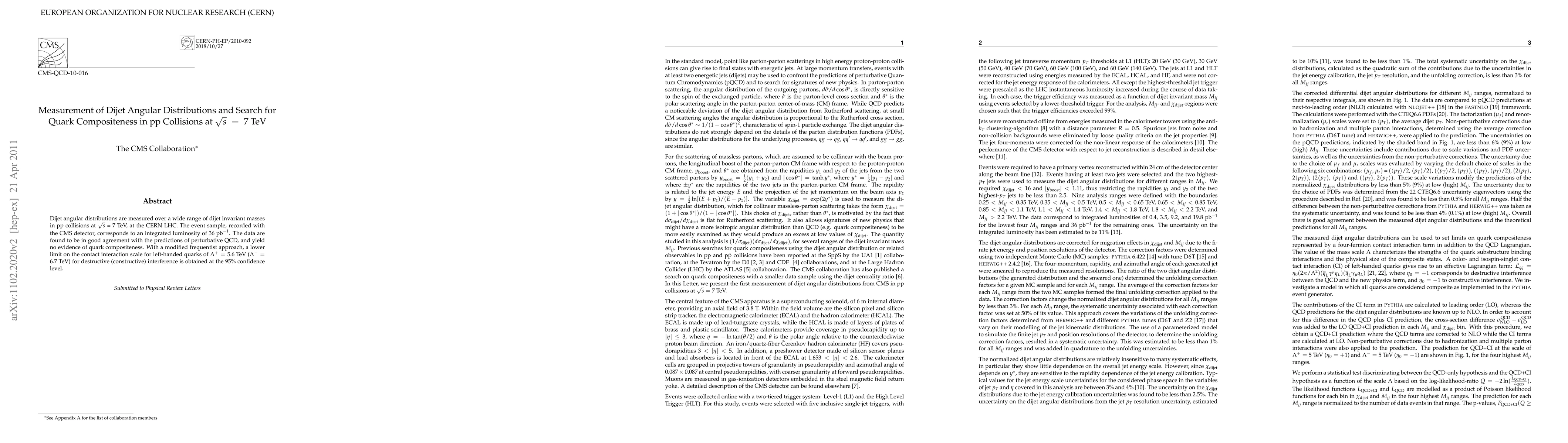 This study measures dijet angular distributions in proton-proton collisions at 7 TeV at the LHC, finding agreement with perturbative QCD predictions and no evidence of quark compositeness. A lower limit on the contact interaction scale for left-handed quarks is determined at 95% confidence level.