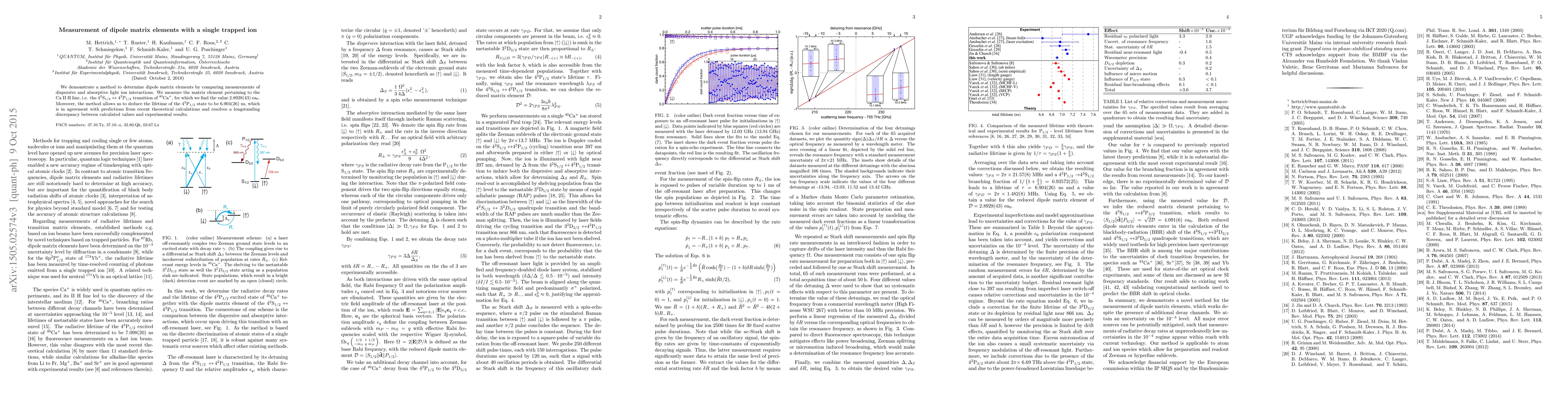 This paper presents a novel method for measuring atomic dipole transition matrix elements using trapped ions, specifically determining the matrix element for the Ca II H line and resolving a longstanding discrepancy in its lifetime measurement. The method combines dispersive and absorptive off-resonant light-ion interactions, yielding a matrix element value of 2.8928(43) ea$_0$ and a state lifetime of 6.904(26) ns.