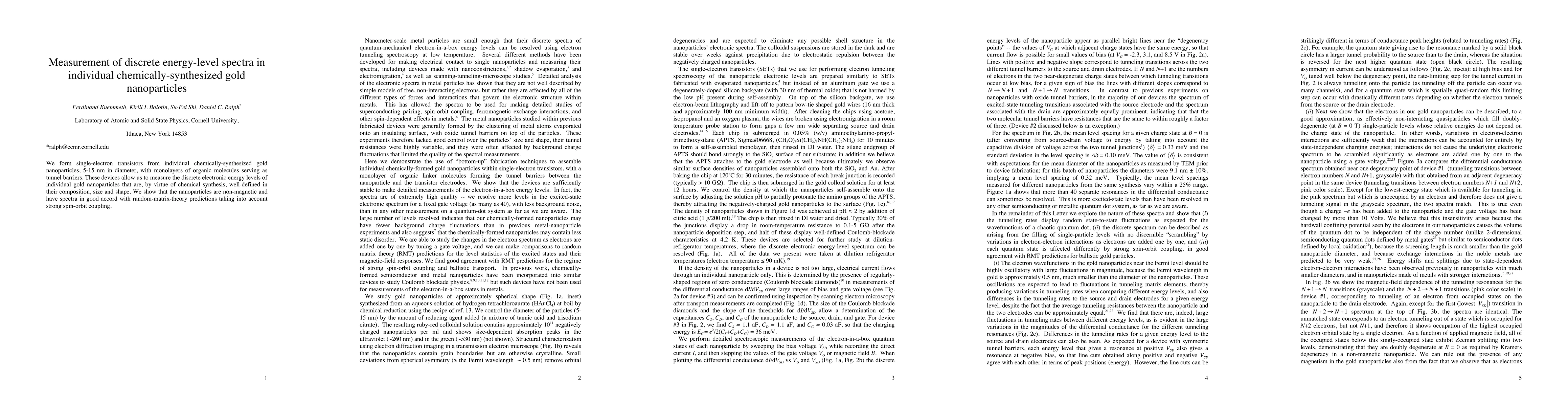 This paper measures discrete energy-level spectra in chemically-synthesized gold nanoparticles using single-electron transistors, finding that the nanoparticles' spectra align with random-matrix-theory predictions, confirming their non-magnetic nature and strong spin-orbit coupling.