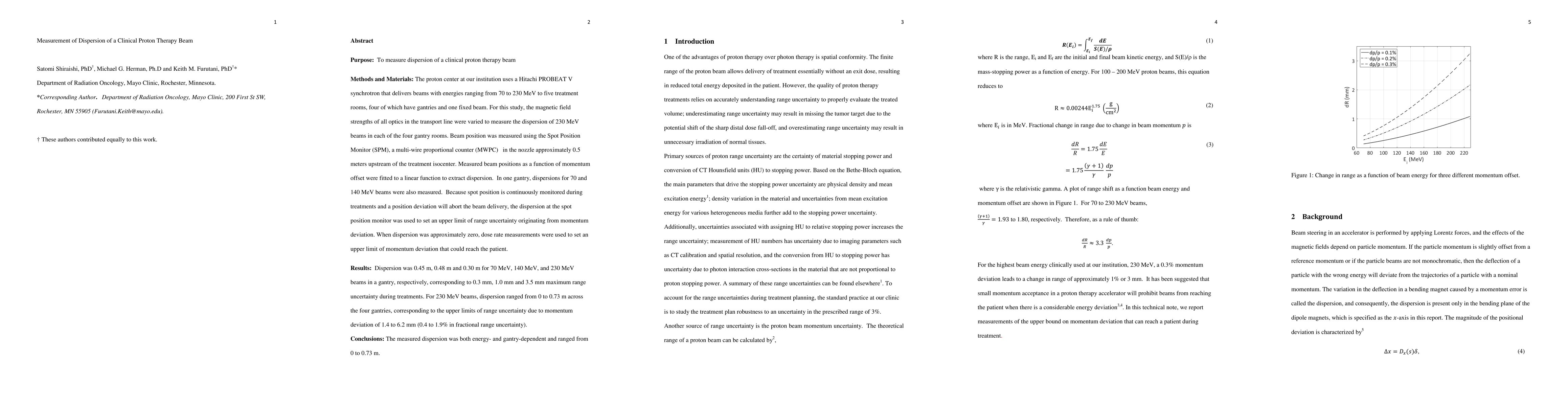 Purpose: To measure dispersion of a clinical proton therapy beam. Methods and Materials: The proton center at our institution uses a Hitachi PROBEAT V synchrotron that delivers beams with energies ranging from 70 to 230 MeV to five treatment rooms, four of which have gantries and one fixed beam. For this study, the magnetic field strengths of all optics in the transport line were varied to measure the dispersion of 230 MeV beams in each of the four gantry rooms. Beam position was measured using the Spot Position Monitor (SPM), a multi-wire proportional counter (MWPC) in the nozzle approximately 0.5 meters upstream of the treatment isocenter. Measured beam positions as a function of momentum offset were fitted to a linear function to extract dispersion. In one gantry, dispersions for 70 and 140 MeV beams were also measured. Because spot position is continuously monitored during treatments and a position deviation will abort the beam delivery, the dispersion at the spot position monitor was used to set an upper limit of range uncertainty originating from momentum deviation. When dispersion was approximately zero, dose rate measurements were used to set an upper limit of momentum deviation that could reach the patient. Results: Dispersion was 0.45 m, 0.48 m and 0.30 m for 70 MeV, 140 MeV, and 230 MeV beams in a gantry, respectively, corresponding to 0.3 mm, 1.0 mm and 3.5 mm maximum range uncertainty during treatments. For 230 MeV beams, dispersion ranged from 0 to 0.73 m across the four gantries, corresponding to the upper limits of range uncertainty due to momentum deviation of 1.4 to 6.2 mm (0.4 to 1.9% in fractional range uncertainty). Conclusions: The measured dispersion was both energy- and gantry-dependent and ranged from 0 to 0.73 m.