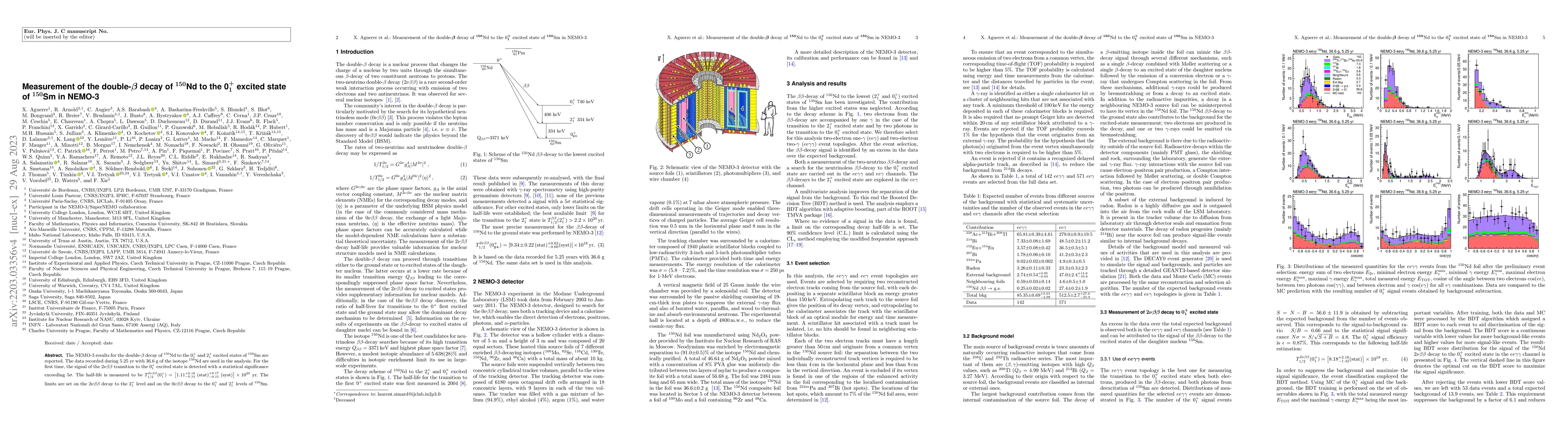 The NEMO-3 experiment detected the $2\nu\beta\beta$ decay of $^{150}$Nd to the 0$^+_1$ excited state of $^{150}$Sm with a 5$\sigma$ significance, measuring its half-life as $1.11^{+0.19}_{-0.14} \times10^{20}$ yr. Limits were also established for the $2\nu\beta\beta$ decay to the 2$^+_1$ level and for $0\nu\beta\beta$ decay to both 0$^+_1$ and 2$^+_1$ levels.