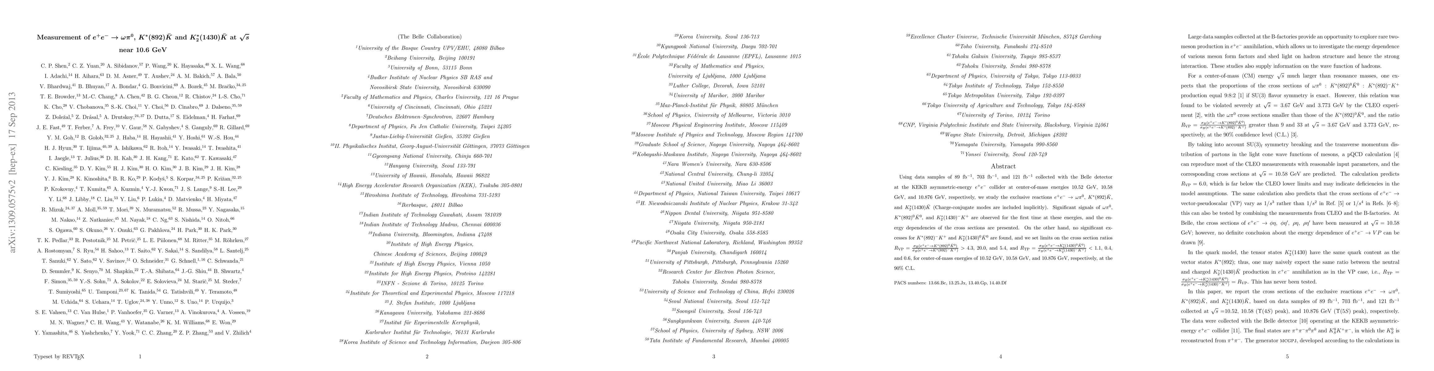 Using data samples of 89 fb$^{-1}$, 703 fb$^{-1}$, and 121 fb$^{-1}$ collected with the Belle detector at the KEKB asymmetric-energy $e^+e^-$ collider at center-of-mass energies 10.52 GeV, 10.58 GeV, and 10.876 GeV, respectively, we study the exclusive reactions $e^+e^- \to \omega\pi^0$, $K^{\ast}(892)\bar{K}$, and $K_2^{\ast}(1430)\bar{K}$ (Charge-conjugate modes are included implicitly). Significant signals of $\omega\pi^0$, $K^{\ast}(892)^0\bar{K}^0$, and $K_2^{\ast}(1430)^-K^+$ are observed for the first time at these energies, and the energy dependencies of the cross sections are presented. On the other hand, no significant excesses for $K^{\ast}(892)^-K^+$ and $K_2^{\ast}(1430)^0 \bar{K}^0$ are found, and we set limits on the cross section ratios $R_{\rm VP} = \frac{\sigma_B(e^+e^-\to K^{\ast}(892)^0\bar K^0)} {\sigma_B(e^+e^-\to K^{\ast}(892)^-K^+)}>$ 4.3, 20.0, and 5.4, and $R_{\rm TP} = \frac{\sigma_B(e^+e^-\to K_2^{\ast}(1430)^0\bar K^0)} {\sigma_B(e^+e^-\to K_2^{\ast}(1430)^-K^+)}<$ 1.1, 0.4, and 0.6, for center-of-mass energies of 10.52 GeV, 10.58 GeV, and 10.876 GeV, respectively, at the 90% C.L.