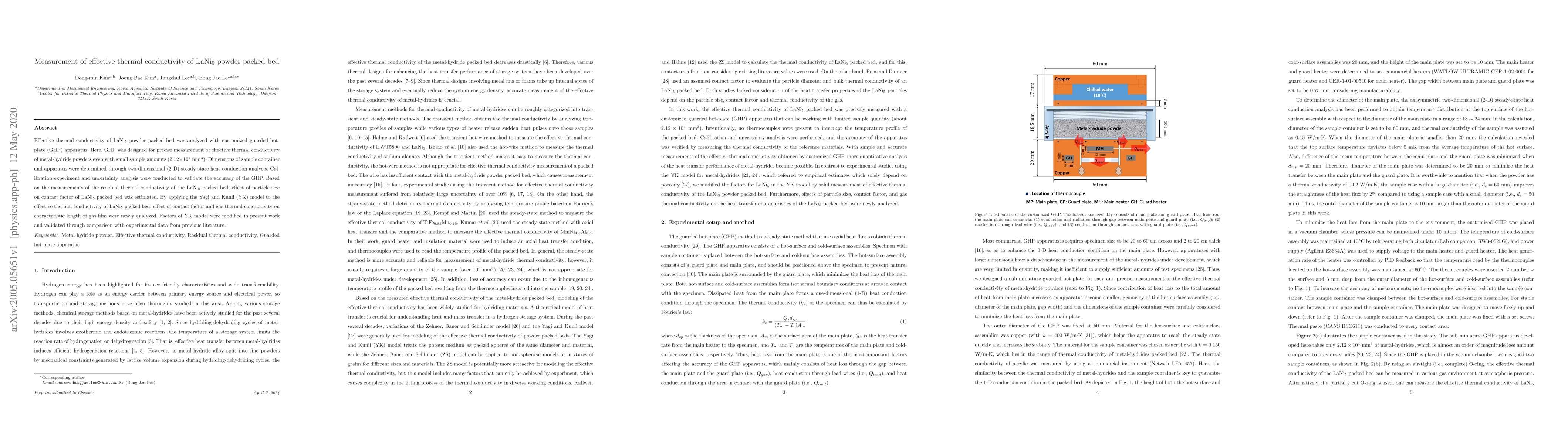Effective thermal conductivity of LaNi$_5$ powder packed bed was analyzed with customized guarded hot-plate (GHP) apparatus. Here, GHP was designed for precise measurement of effective thermal conductivity of metal-hydride powders even with small sample amounts (2.12$\times$10$^4$ mm$^3$). Dimensions of sample container and apparatus were determined through two-dimensional (2-D) steady-state heat conduction analysis. Calibration experiment and uncertainty analysis were conducted to validate the accuracy of the GHP. Based on the measurements of the residual thermal conductivity of the LaNi$_5$ packed bed, effect of particle size on contact factor of LaNi$_5$ packed bed was estimated. By applying the Yagi and Kunii (YK) model to the effective thermal conductivity of LaNi$_5$ packed bed, effect of contact factor and gas thermal conductivity on characteristic length of gas film were newly analyzed. Factors of YK model were modified in present work and validated through comparison with experimental data from previous literature.