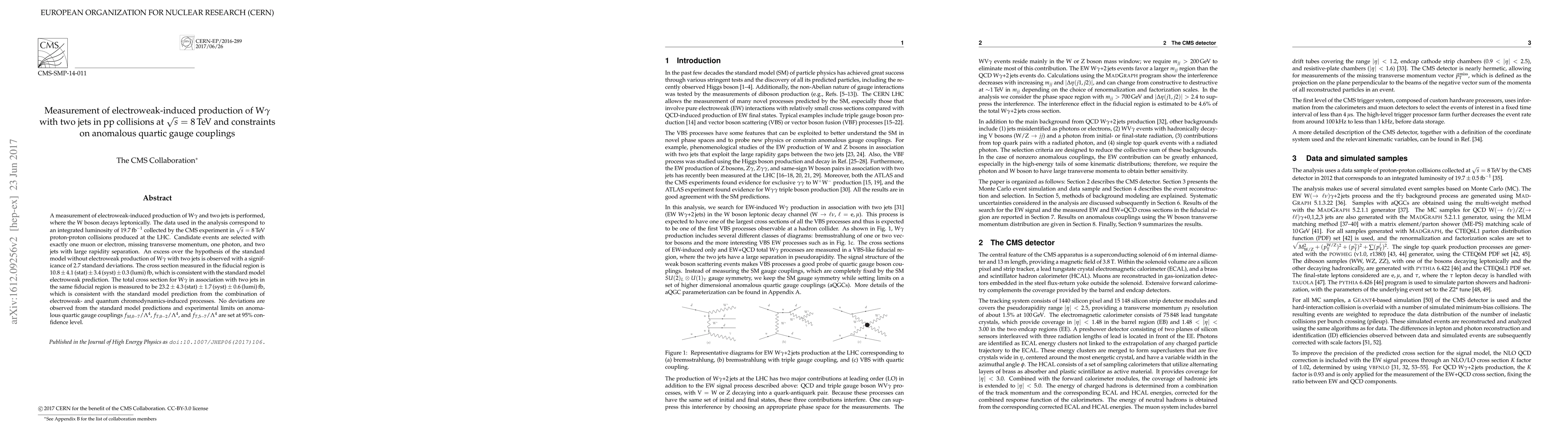 The CMS experiment measures electroweak-induced W gamma production with two jets in 8 TeV proton-proton collisions, observing a 2.7-sigma excess over standard model predictions. No deviations from standard model expectations are found, and constraints on anomalous quartic gauge couplings are established.