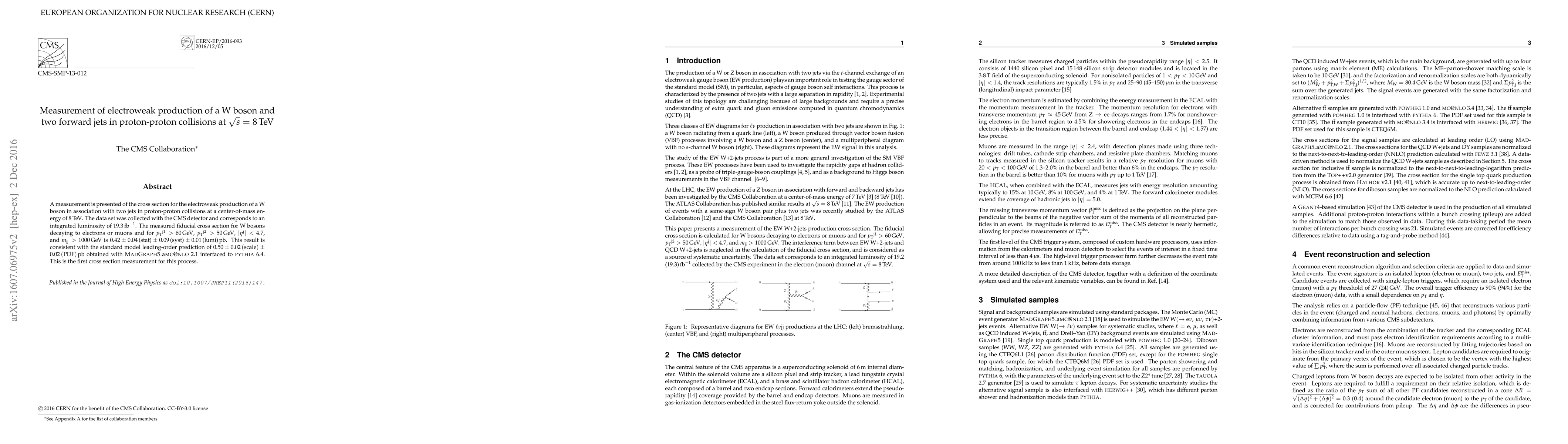 This paper presents the first measurement of the electroweak production of a W boson with two forward jets in proton-proton collisions at 8 TeV, yielding a fiducial cross section of 0.42 ± 0.04 (stat) ± 0.09 (syst) ± 0.01 (lumi) pb, consistent with the standard model prediction.