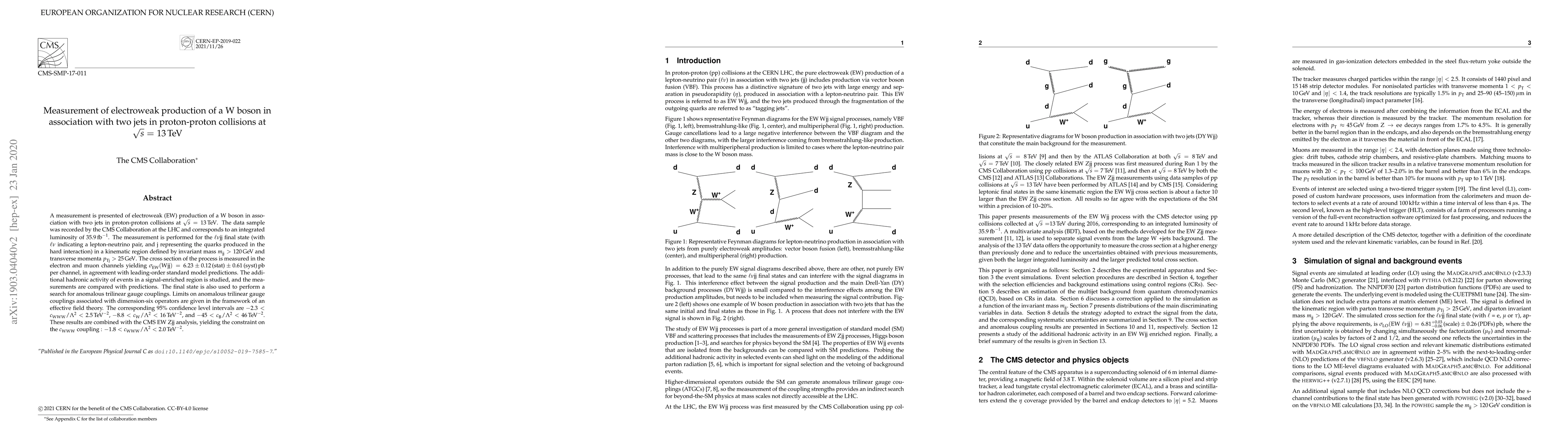 This paper reports a measurement of electroweak W boson production with two jets in proton-proton collisions at 13 TeV by the CMS Collaboration, yielding a cross section of 6.23 ± 0.12 pb, consistent with Standard Model predictions. It also sets limits on anomalous trilinear gauge couplings in an effective field theory framework.