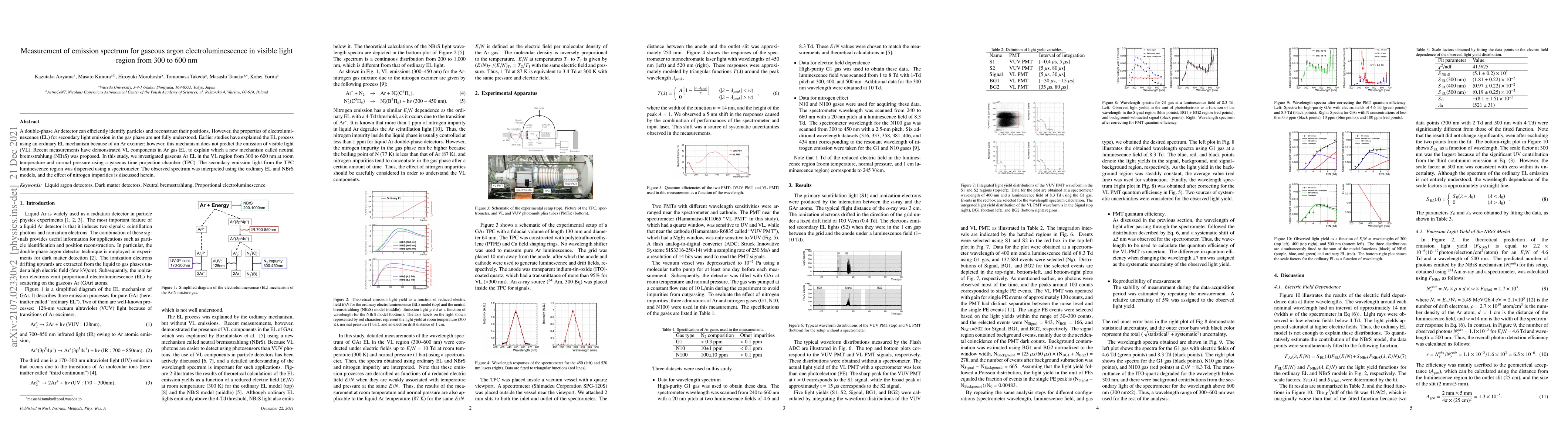 A double-phase Ar detector can efficiently identify particles and reconstruct their positions. However, the properties of electroluminescence (EL) for secondary light emission in the gas phase are not fully understood. Earlier studies have explained the EL process using an ordinary EL mechanism because of an Ar excimer; however, this mechanism does not predict the emission of visible light (VL). Recent measurements have demonstrated VL components in Ar gas EL, to explain which a new mechanism called neutral bremsstrahlung (NBrS) was proposed. In this study, we investigated gaseous Ar EL in the VL region from 300 to 600 nm at room temperature and normal pressure using a gaseous time projection chamber (TPC). The secondary emission light from the TPC luminescence region was dispersed using a spectrometer. The observed spectrum was interpreted using the ordinary EL and NBrS models, and the effect of nitrogen impurities is discussed herein.