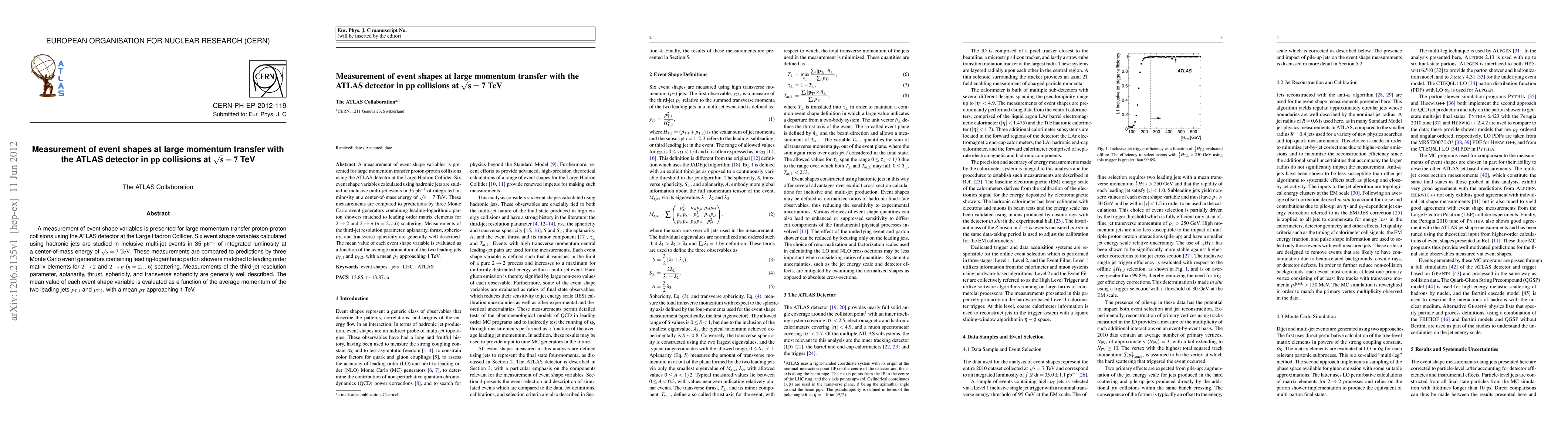 This paper reports on the measurement of event shape variables in large momentum transfer proton-proton collisions at sqrt(s) = 7 TeV using the ATLAS detector. The results are generally consistent with predictions from three Monte Carlo event generators, highlighting the reliability of these models in describing multi-jet events.