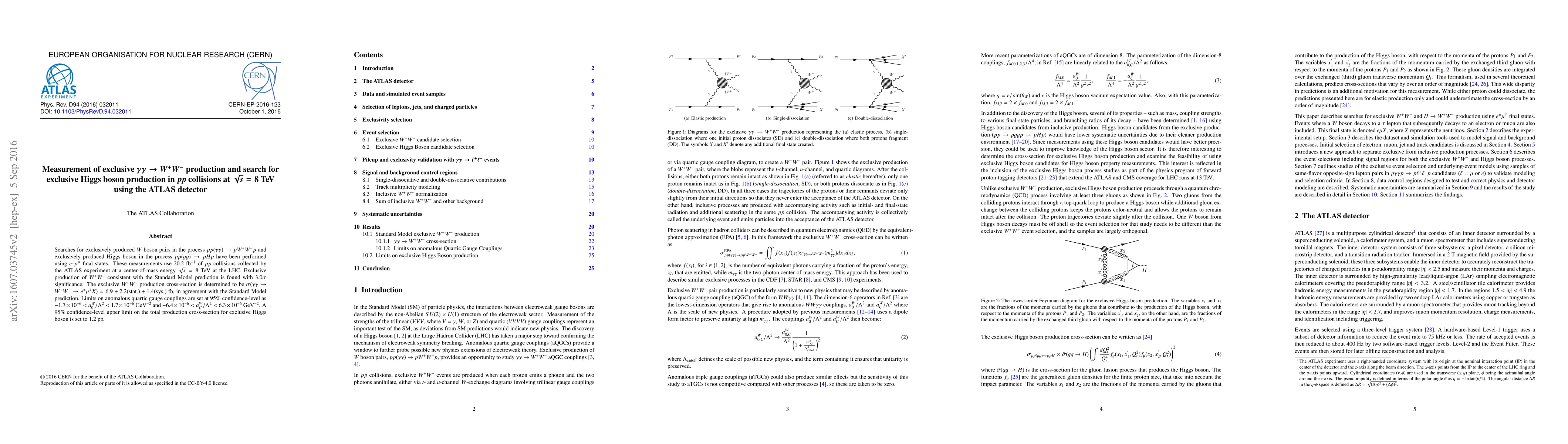 This paper reports on the measurement of exclusive $W^+W^-$ production via $\gamma\gamma$ fusion and searches for exclusive Higgs boson production in $pp$ collisions at $\sqrt{s} = 8$ TeV using the ATLAS detector. The study finds consistent $W^+W^-$ production with Standard Model predictions and sets limits on anomalous quartic gauge couplings and an upper limit on exclusive Higgs boson production.