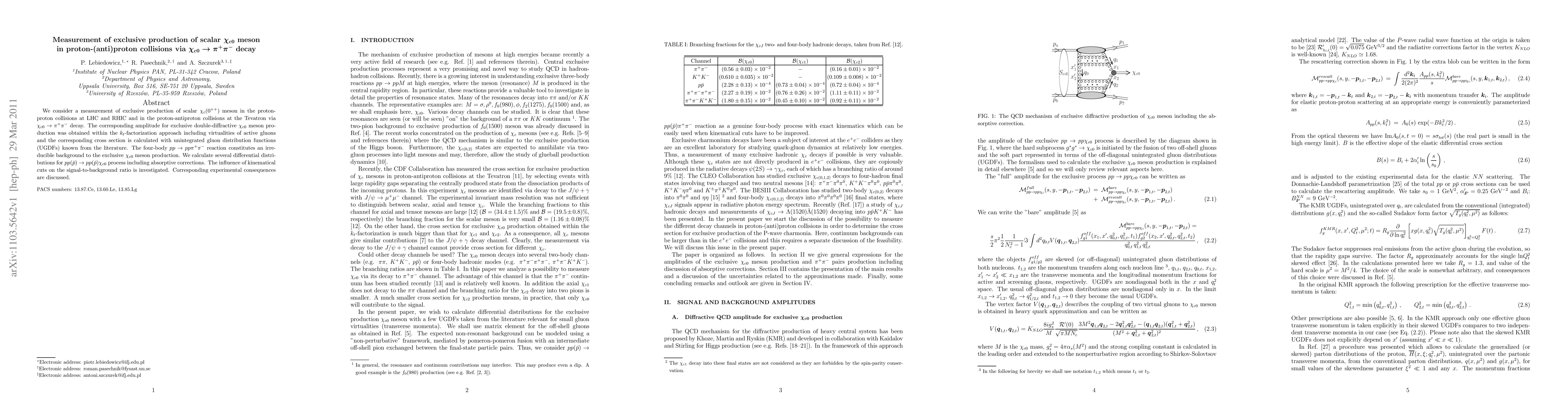This paper measures the exclusive production of the scalar $\chi_{c0}$ meson in proton-proton and proton-antiproton collisions using the $\chi_{c0} \to \pi^{+}\pi^{-}$ decay channel. It calculates the corresponding cross section using the $k_{t}$-factorization approach and UGDFs, and investigates differential distributions and the signal-to-background ratio under various kinematical cuts.
