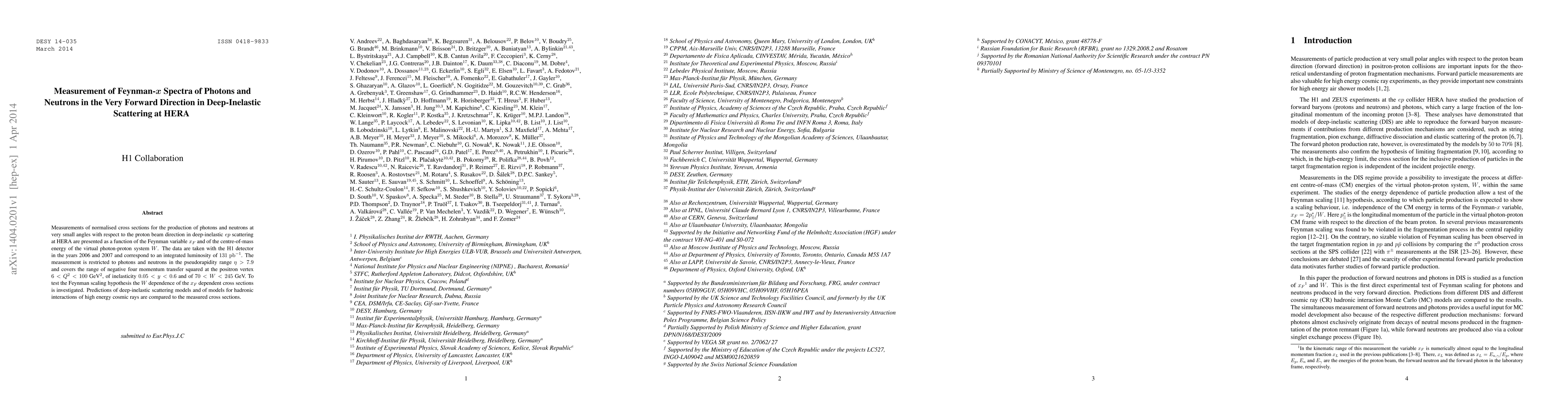 This paper presents measurements of photon and neutron production in deep-inelastic $ep$ scattering at HERA, focusing on very forward angles and analyzing the data as a function of the Feynman variable $x_F$ and centre-of-mass energy $W$. The results support the Feynman scaling hypothesis and are compared with theoretical models.