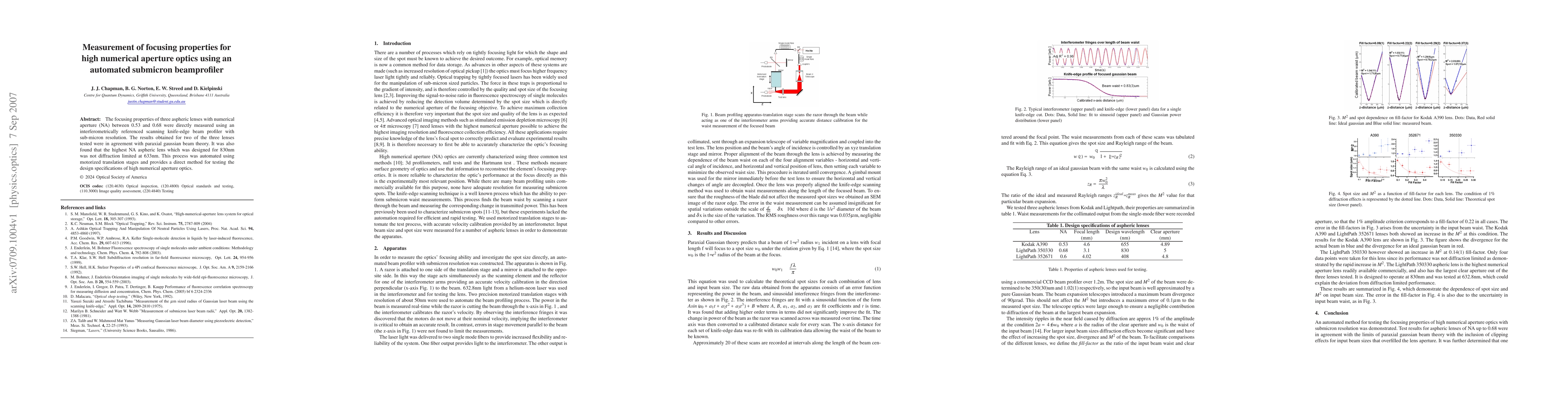Researchers measured focusing properties of high numerical aperture optics using an automated submicron beam profiler, finding that two lenses matched paraxial gaussian beam theory but one lens was not diffraction limited at a different wavelength.