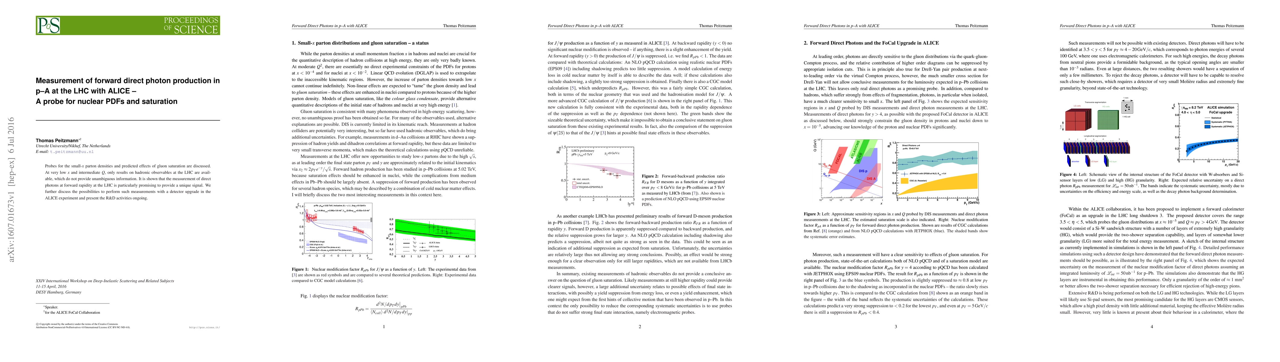 Probes for the small-x parton densities and predicted effects of gluon saturation are discussed. At very low x and intermediate Q, only results on hadronic observables at the LHC are available, which do not provide unambiguous information. It is shown that the measurement of direct photons at forward rapidity at the LHC is particularly promising to provide a unique signal. We further discuss the possibilities to perform such measurements with a detector upgrade in the ALICE experiment and present the R&D activities ongoing.