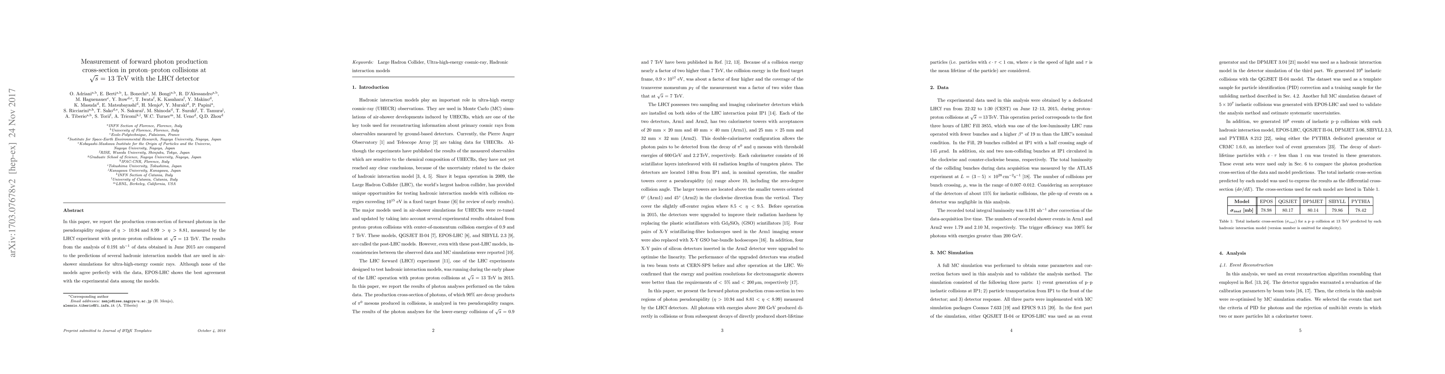 The LHCf detector measured the production cross-section of forward photons in proton-proton collisions at 13 TeV, with EPOS-LHC showing the best agreement among hadronic interaction models.