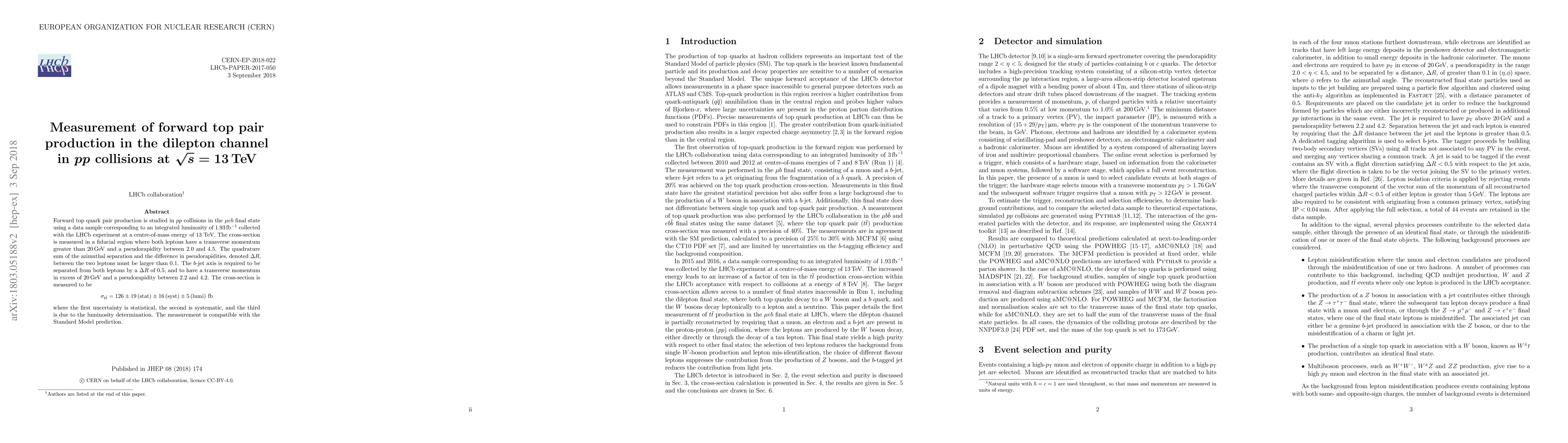 Forward top quark pair production is studied in $pp$ collisions in the $\mu eb$ final state using a data sample corresponding to an integrated luminosity of 1.93 fb$^{-1}$ collected with the LHCb experiment at a centre-of-mass energy of 13 TeV. The cross-section is measured in a fiducial region where both leptons have a transverse momentum greater than 20 GeV and a pseudorapidity between 2.0 and 4.5. The quadrature sum of the azimuthal separation and the difference in pseudorapidities, denoted $\Delta R$, between the two leptons must be larger than 0.1. The $b$-jet axis is required to be separated from both leptons by a $\Delta R$ of 0.5, and to have a transverse momentum in excess of 20 GeV and a pseudorapidity between 2.2 and 4.2. The cross-section is measured to be $$\sigma_{t\bar{t}}= 126\pm19\,(\mathrm{stat})\pm16\,(\mathrm{syst})\pm5\,(\mathrm{lumi})\,\,\mathrm{ fb}$$ where the first uncertainty is statistical, the second is systematic, and the third is due to the luminosity determination. The measurement is compatible with the Standard Model prediction.
