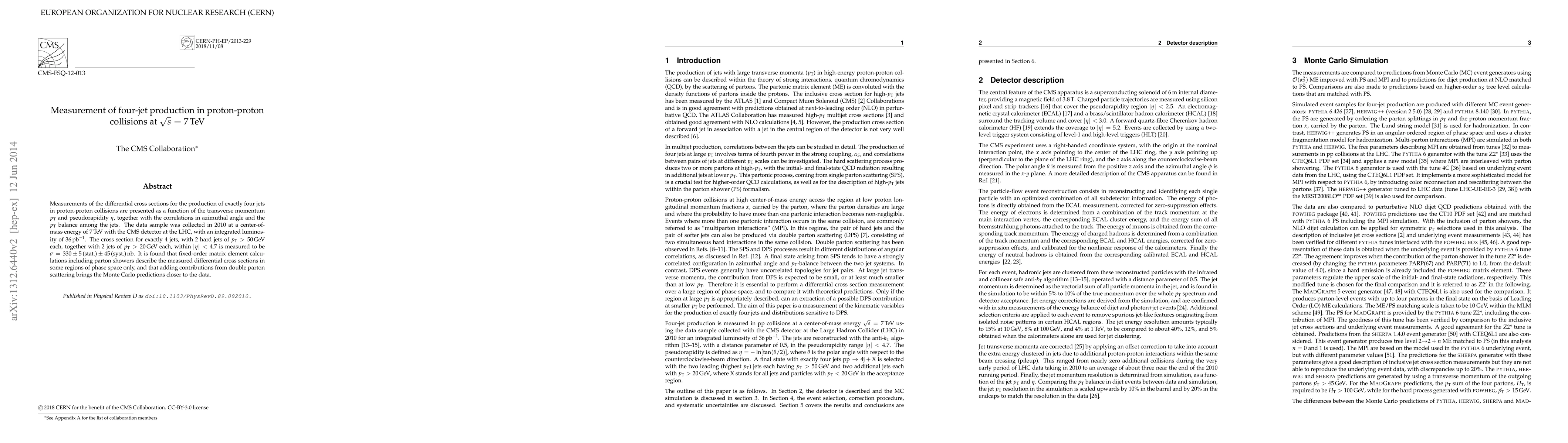 Researchers measured the production of exactly four jets in proton-proton collisions at 7 TeV, finding that some calculations need improvement to match data, but adding double parton scattering helps.