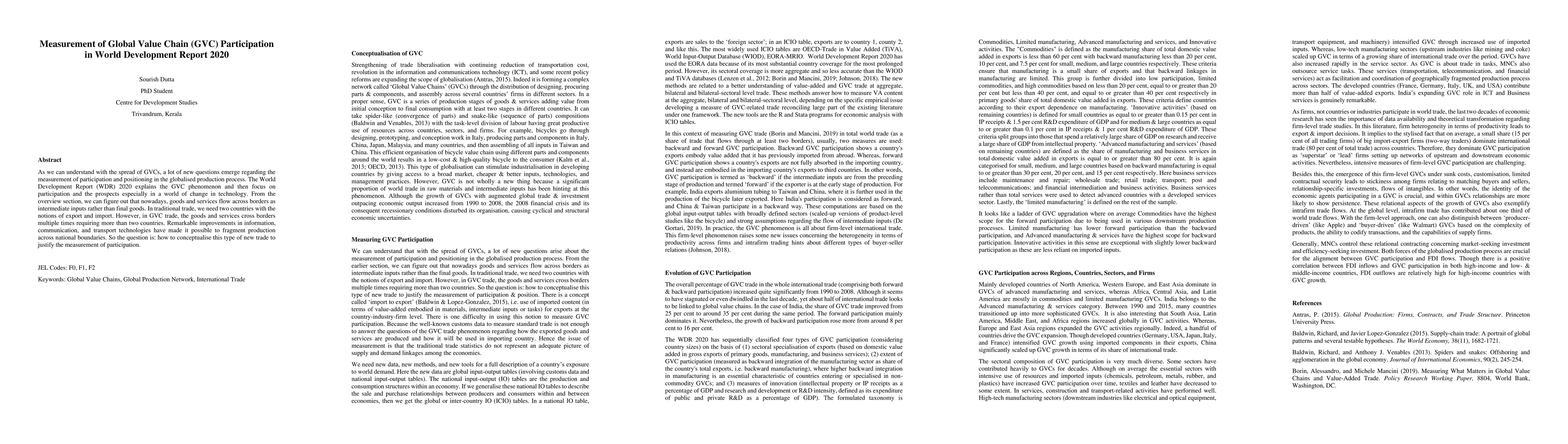 As we can understand with the spread of GVCs, a lot of new questions emerge regarding the measurement of participation and positioning in the globalised production process. The World Development Report (WDR) 2020 explains the GVC phenomenon and then focus on participation and the prospects especially in a world of change in technology. From the overview section, we can figure out that nowadays, goods and services flow across borders as intermediate inputs rather than final goods. In traditional trade, we need two countries with the notions of export and import. However, in GVC trade, the goods and services cross borders multiple times requiring more than two countries. Remarkable improvements in information, communication, and transport technologies have made it possible to fragment production across national boundaries. So the question is: how to conceptualise this type of new trade to justify the measurement of participation.