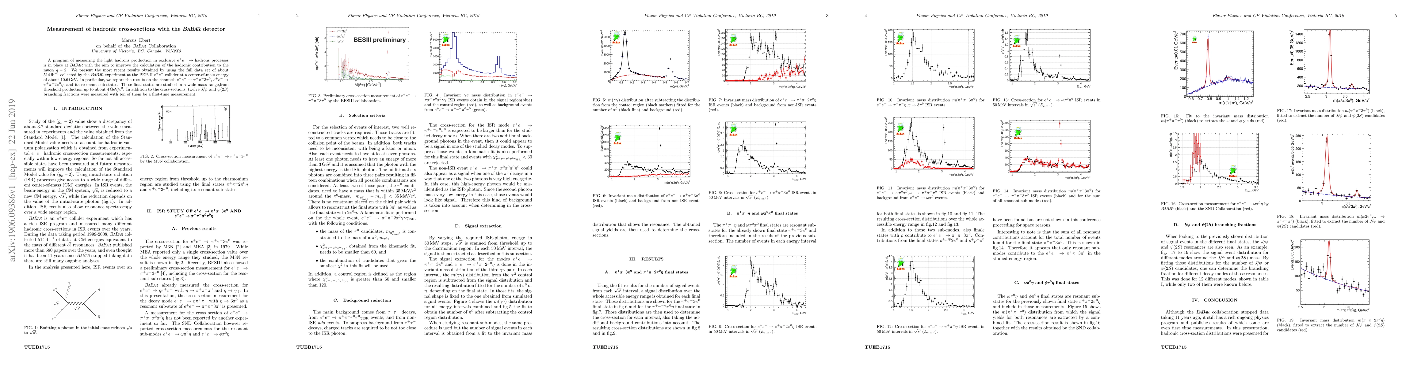 A program of measuring the light hadrons production in exclusive $e^+e^-$ to hadrons processes is in place at BaBar with the aim to improve the calculation of the hadronic contribution to the muon $g-2$. We present the most recent results obtained by using the full data set of about $514 \mathrm{fb}^{-1}$ collected by the BaBar experiment at the PEP-II $e^+e^-$ collider at a center-of-mass energy of about $10.6$ GeV. In particular, we report the results on the channels $e^+e^-\rightarrow \pi^+ \pi^- 3\pi^0$, $e^+e^-\rightarrow \pi^+\pi^- 2\pi^0\eta$, and its resonant sub-states. These final states are studied in a wide mass range,from threshold production up to about $4 GeV/c^2$. In addition to the cross-sections, twelve $J/\psi$ and $\psi(2S)$ branching fractions were measured with ten of them be a first-time measurement.