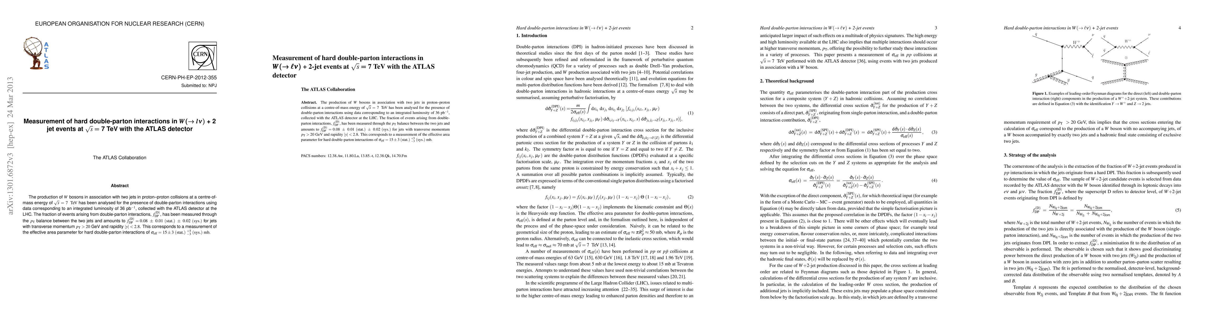 The ATLAS detector at the LHC measured the fraction of W boson events with two jets indicating double-parton interactions at sqrt(s)=7 TeV, finding fDP(D) = 0.08 ± 0.01 (stat.) ± 0.02 (sys.). The effective area parameter for these interactions was determined to be σ_eff = 15 ± 3 (stat.) ± 5 -3 (sys.) mb.