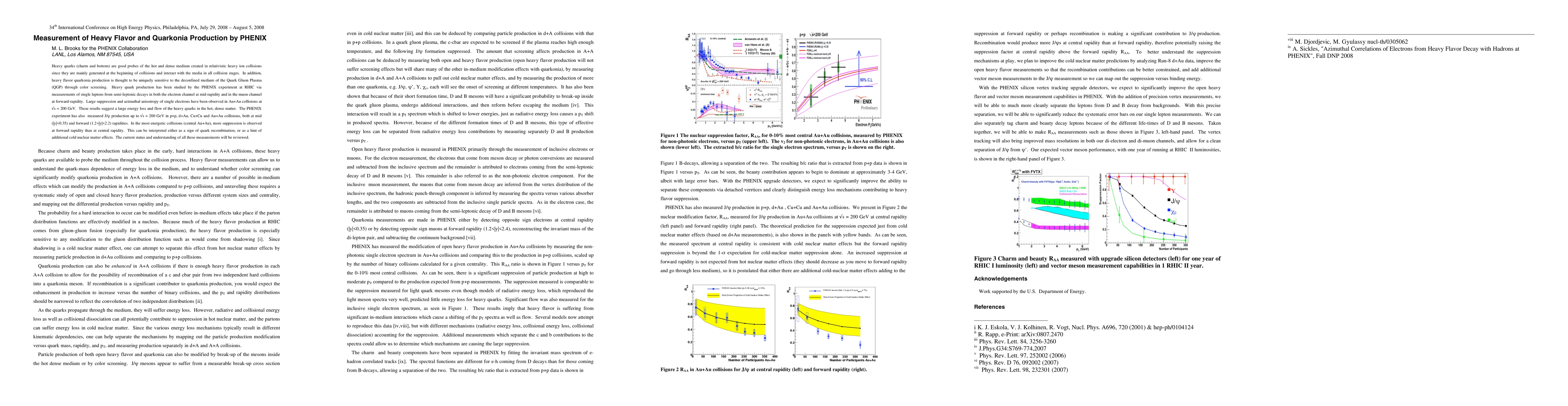 The PHENIX experiment at RHIC investigates heavy flavor and quarkonia production in relativistic heavy ion collisions, revealing significant suppression and anisotropy of heavy quarks indicative of large energy loss in the Quark Gluon Plasma. Additionally, J/psi production shows more suppression in central Au+Au collisions at forward rapidity, suggesting quark recombination or cold nuclear matter effects.