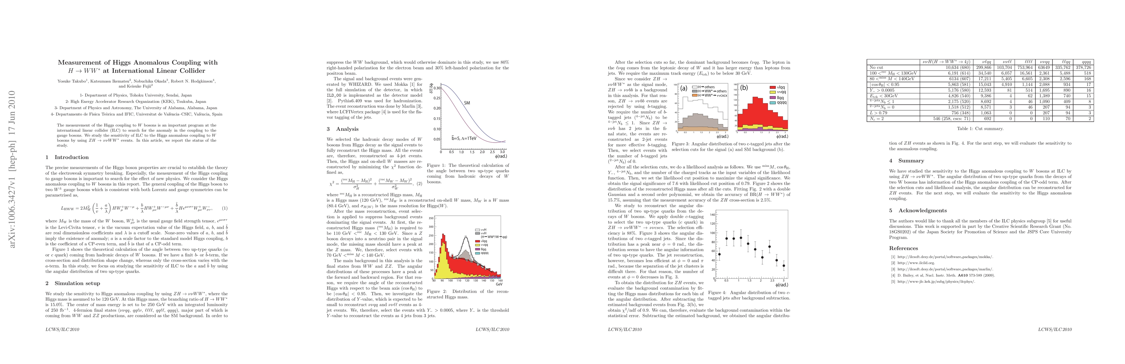 The measurement of the Higgs coupling to W bosons is an important program at the international linear collider (ILC) to search for the anomaly in the coupling to the gauge bosons. We study the sensitivity of ILC to the Higgs anomalous coupling to W bosons by using ZH->vvWW* events. In this article, we report the status of the study.
