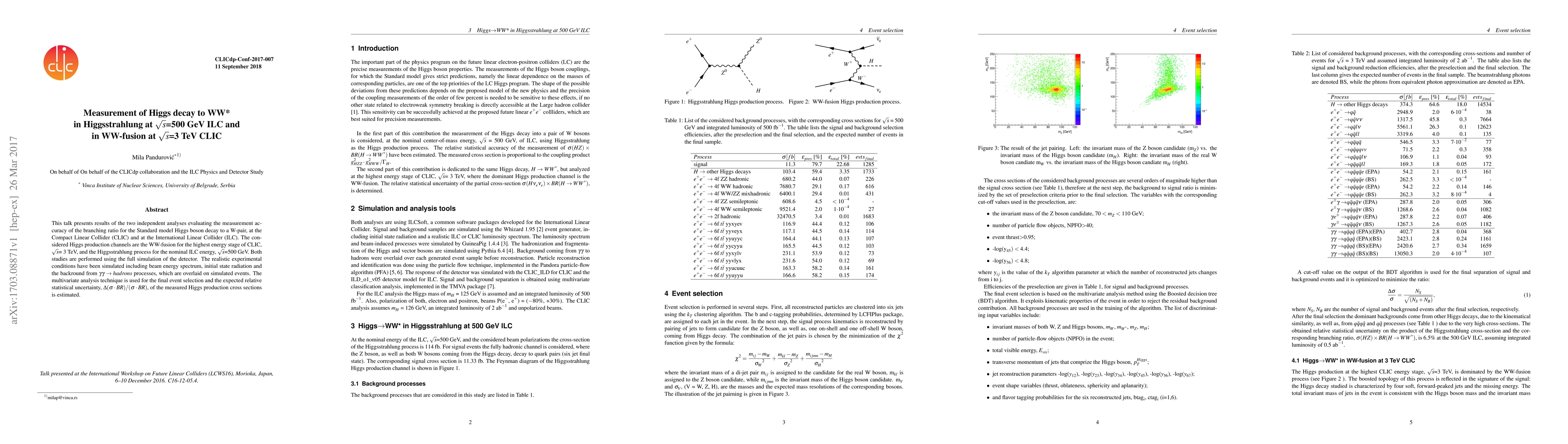 This talk presents results of the two independent analyses evaluating the measurement accuracy of the branching ratio for the Standard model Higgs boson decay to a W-pair, at the Compact Linear Collider (CLIC) and at the International Linear Collider (ILC). The considered Higgs production channels are the WW-fusion for the highest energy stage of CLIC, $\sqrt{s}$= 3 TeV, and the Higgsstrahlung process for the nominal ILC energy, $\sqrt{s}$=500 GeV. Both studies are performed using the full simulation of the detector. The realistic experimental conditions have been simulated including beam energy spectrum, initial state radiation and the backround from $\gamma\gamma\rightarrow hadrons$ processes, which are overlaid on simulated events. The multivariate analysis technique is used for the final event selection and the expected relative statistical uncertainty, $\Delta (\sigma \cdot BR) / (\sigma\cdot BR)$, of the measured Higgs production cross sections is estimated.