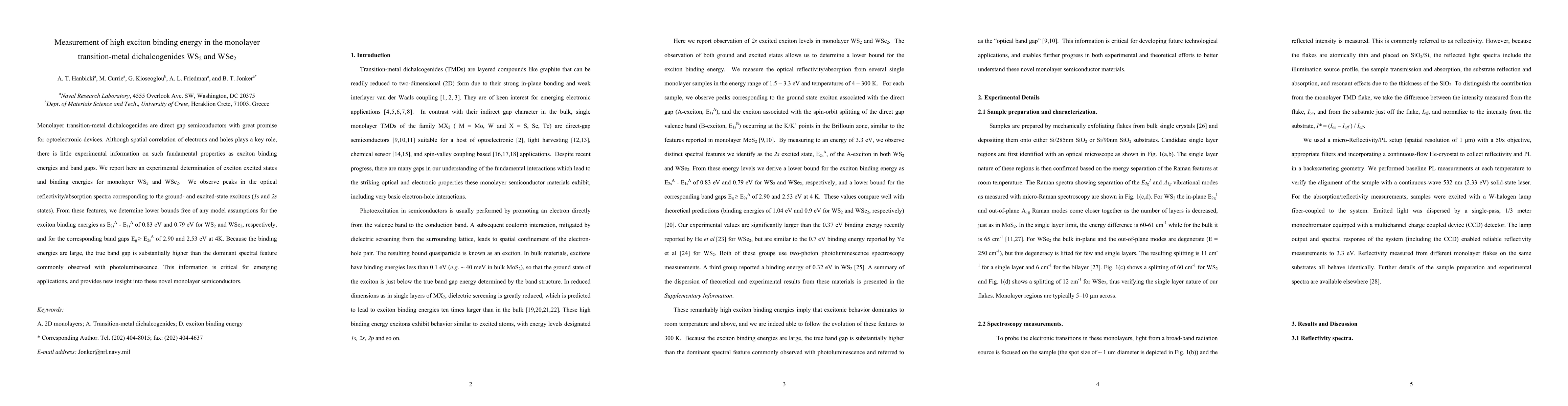 This paper reports the experimental determination of exciton binding energies in monolayer WS2 and WSe2, finding high values of 0.83 eV and 0.79 eV respectively, indicating strong electron-hole interactions. These results suggest a higher true band gap than commonly observed, crucial for optoelectronic applications.