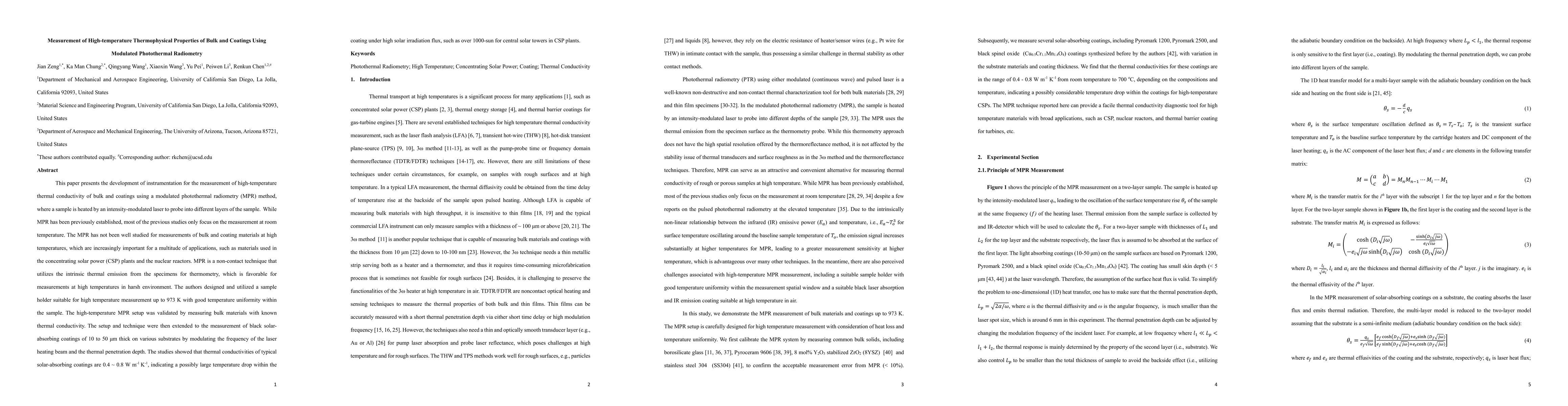 This paper develops a modulated photothermal radiometry (MPR) method for measuring high-temperature thermal conductivity in bulk materials and coatings, validated by comparing results with known bulk materials and examining solar-absorbing coatings, revealing significant temperature drops under high solar irradiation.