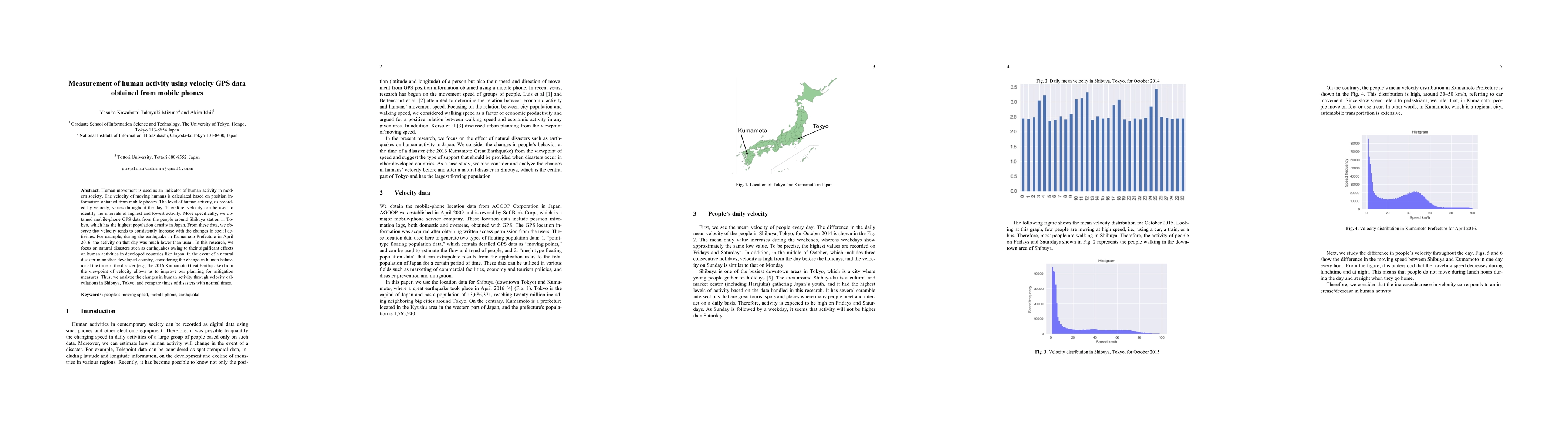 This study measures human activity using velocity GPS data from mobile phones around Shibuya station in Tokyo, finding that velocity correlates with social activity levels. It highlights how natural disasters, like the 2016 Kumamoto earthquake, significantly alter human movement patterns, offering insights for disaster mitigation planning.