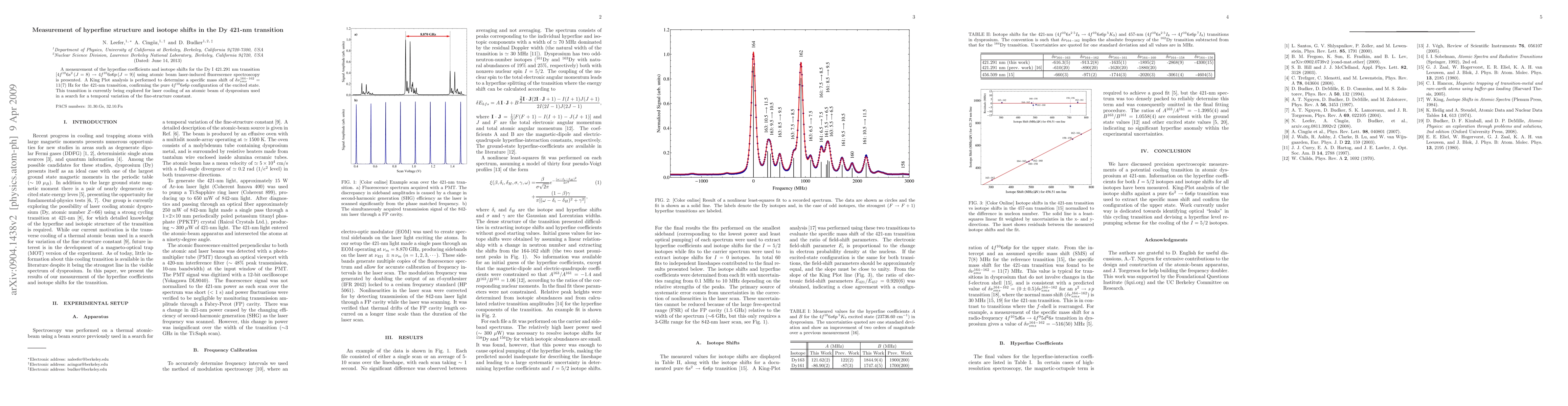 Researchers measured hyperfine structure and isotope shifts in a specific transition of dysprosium atoms, confirming its excited state configuration, which has implications for laser cooling and fine-structure constant research.