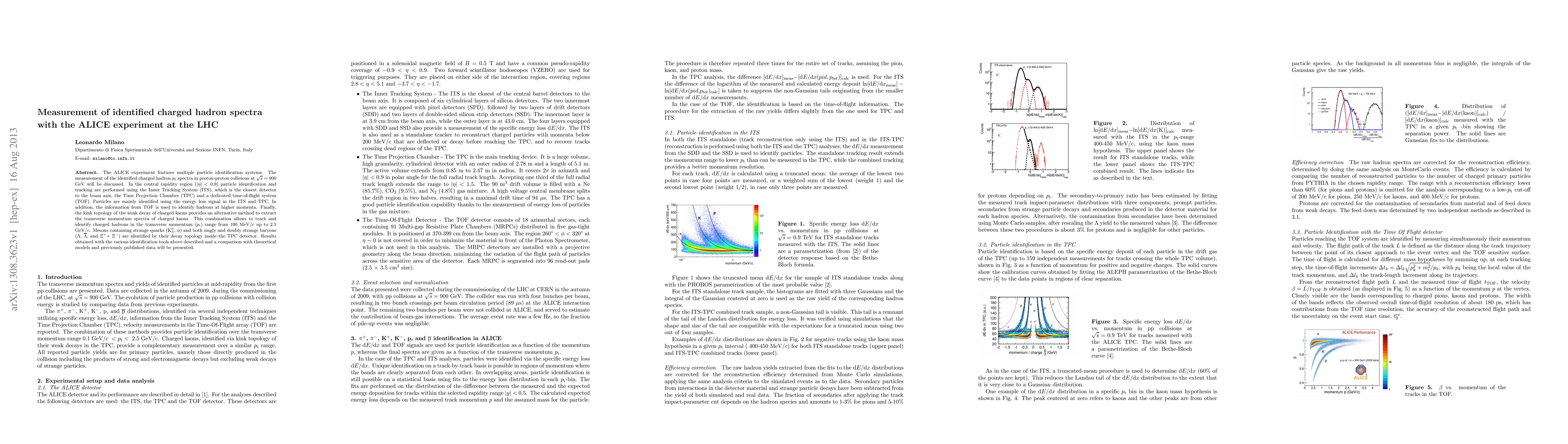 The ALICE experiment measured charged hadron spectra in proton-proton collisions at LHC, identifying particles using multiple systems including ITS, TPC, and TOF, with results compared to theoretical models and previous data.