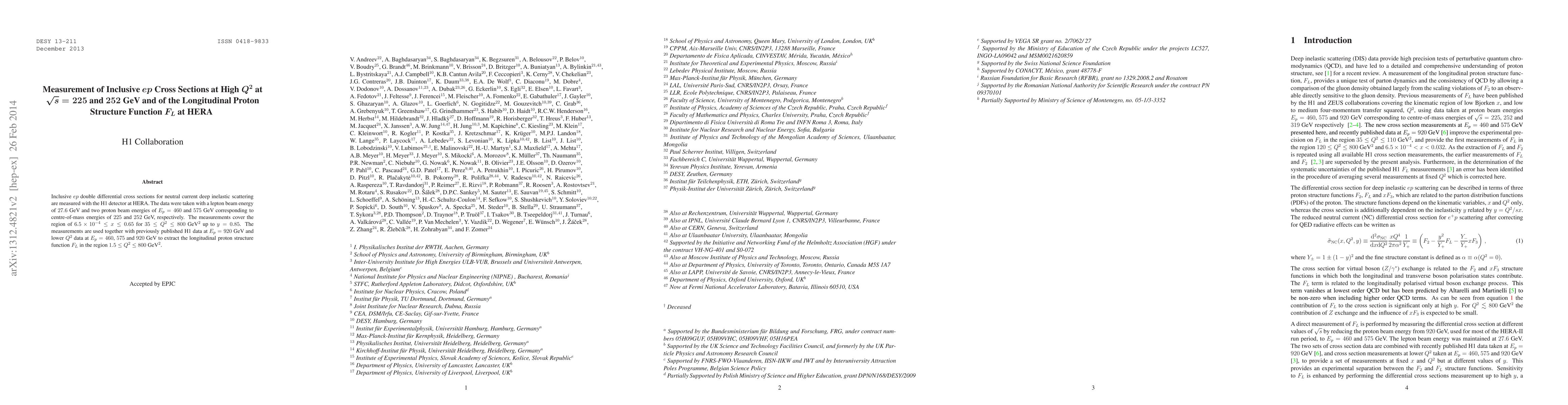 Inclusive ep double differential cross sections for neutral current deep inelastic scattering are measured with the H1 detector at HERA. The data were taken with a lepton beam energy of 27.6 GeV and two proton beam energies of Ep = 460 and 575 GeV corresponding to centre-of-mass energies of 225 and 252 GeV, respectively. The measurements cover the region of 6.5 *10^{-4}<=x<= 0.65 for 35<=Q^2<=800 GeV^2 up to y = 0.85. The measurements are used together with previously published H1 data at Ep = 920 GeV and lower Q2 data at Ep = 460, 575 and 920 GeV to extract the longitudinal proton structure function FL in the region 1.5<=Q^2 <=800 GeV^2.
