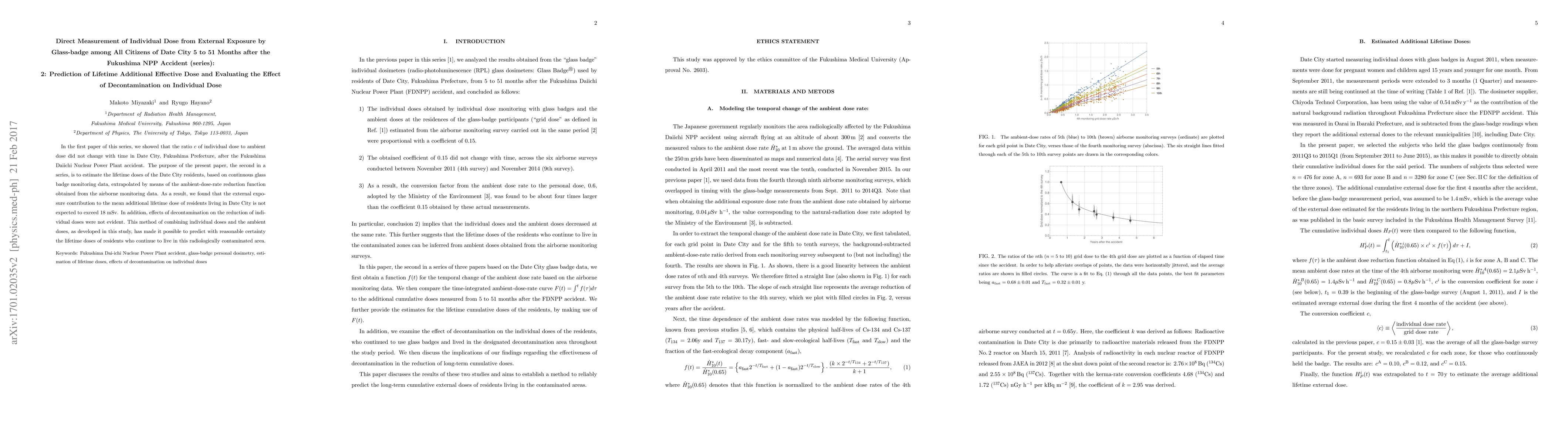 In the first paper of this series, we showed that the ratio c of individual dose to ambient dose did not change with time in Date City, Fukushima Prefecture, after the Fukushima Daiichi Nuclear Power Plant accident. The purpose of the present paper, the second in a series, is to estimate the lifetime doses of the Date City residents, based on continuous glass badge monitoring data, extrapolated by means of the ambient-dose-rate reduction function obtained from the airborne monitoring data. As a result, we found that the mean additional lifetime dose of residents living in Date City is not expected to exceed 18 mSv. In addition, effects of decontamination on the reduction of individual doses were not evident. This method of combining individual doses and the ambient doses, as developed in this study, has made it possible to predict with reasonable certainty the lifetime doses of residents who continue to live in this radiologically contaminated area.