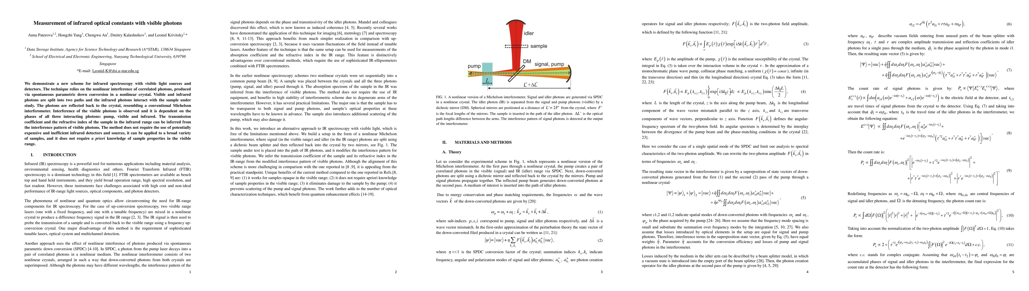 This paper presents a novel infrared spectroscopy technique using visible light sources and detectors, based on nonlinear interference of correlated photons from spontaneous parametric down conversion. The method infers infrared optical constants from the interference pattern of visible photons, eliminating the need for expensive infrared detectors.