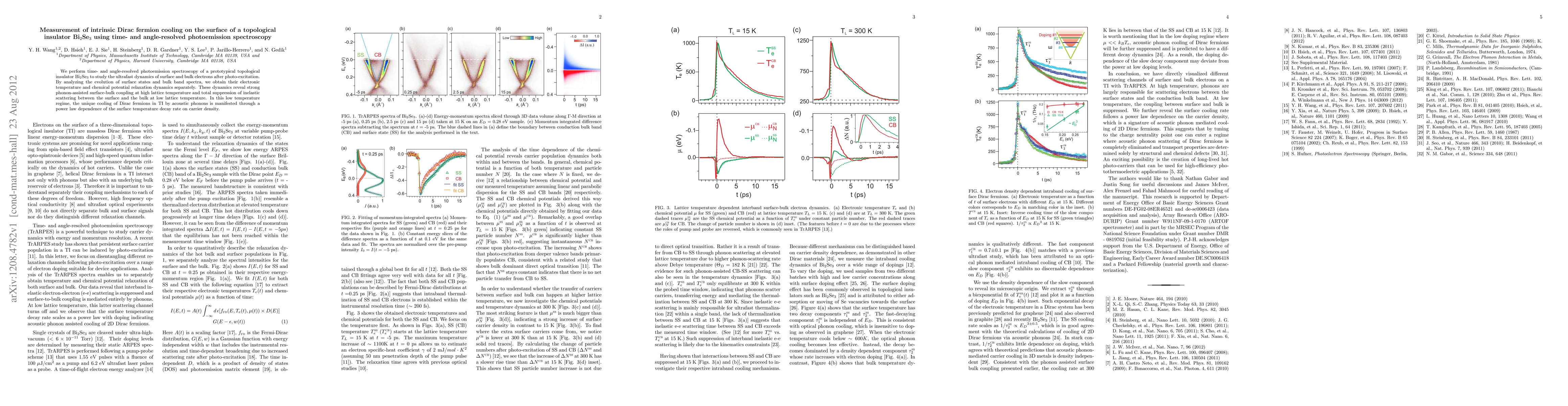 We perform time- and angle-resolved photoemission spectroscopy of a prototypical topological insulator Bi$_2$Se$_3$ to study the ultrafast dynamics of surface and bulk electrons after photo-excitation. By analyzing the evolution of surface states and bulk band spectra, we obtain their electronic temperature and chemical potential relaxation dynamics separately. These dynamics reveal strong phonon-assisted surface-bulk coupling at high lattice temperature and total suppression of inelastic scattering between the surface and the bulk at low lattice temperature. In this low temperature regime, the unique cooling of Dirac fermions in TI by acoustic phonons is manifested through a power law dependence of the surface temperature decay rate on carrier density.
