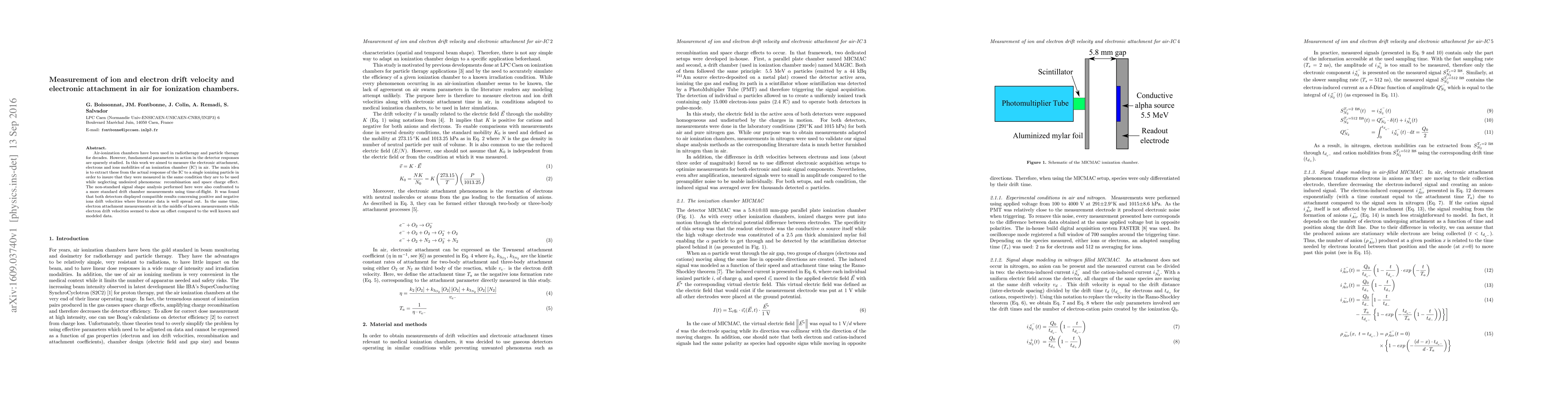 Air-ionization chambers have been used in radiotherapy and particle therapy for decades. However, fundamental parameters in action in the detector responses are sparsely studied. In this work we aimed to measure the electronic attachment, electrons and ions mobilities of an ionization chamber (IC) in air. The main idea is to extract these from the actual response of the IC to a single ionizing particle in order to insure that they were measured in the same condition they are to be used while neglecting undesired phenomena: recombination and space charge effect. The non-standard signal shape analysis performed here were also confronted to a more standard drift chamber measurements using time-of-flight. It was found that both detectors displayed compatible results concerning positive and negative ions drift velocities where literature data is well spread out. In the same time, electron attachment measurements sit in the middle of known measurements while electron drift velocities seemed to show an offset compared to the well known and modeled data.