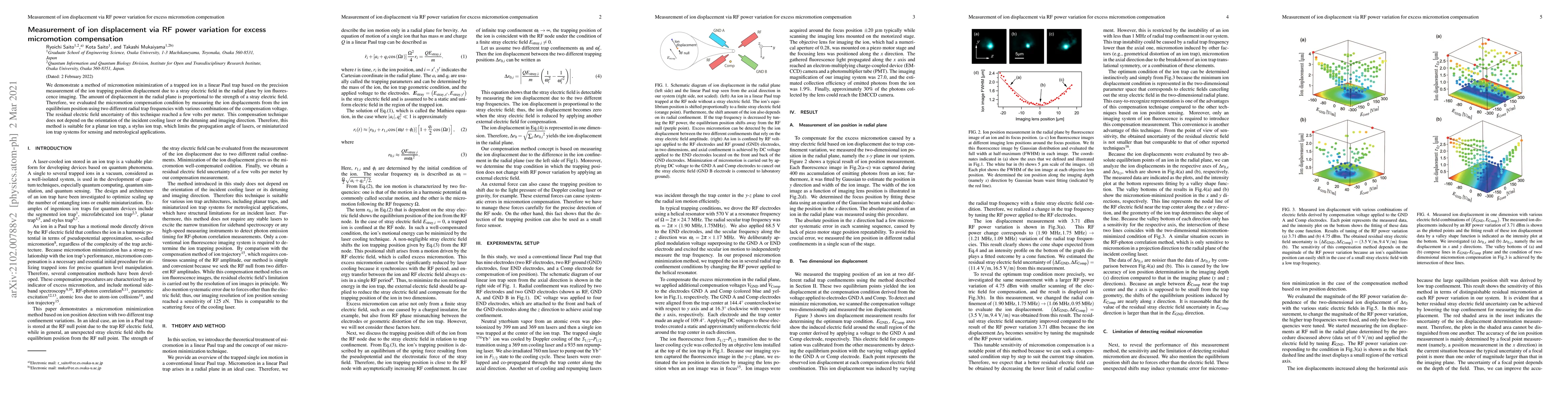 This paper presents a method for minimizing ion micromotion in a linear Paul trap using RF power variation to compensate for stray electric fields, achieving residual electric field uncertainties of a few volts per meter. The technique is independent of laser orientation and suitable for various ion trap designs.
