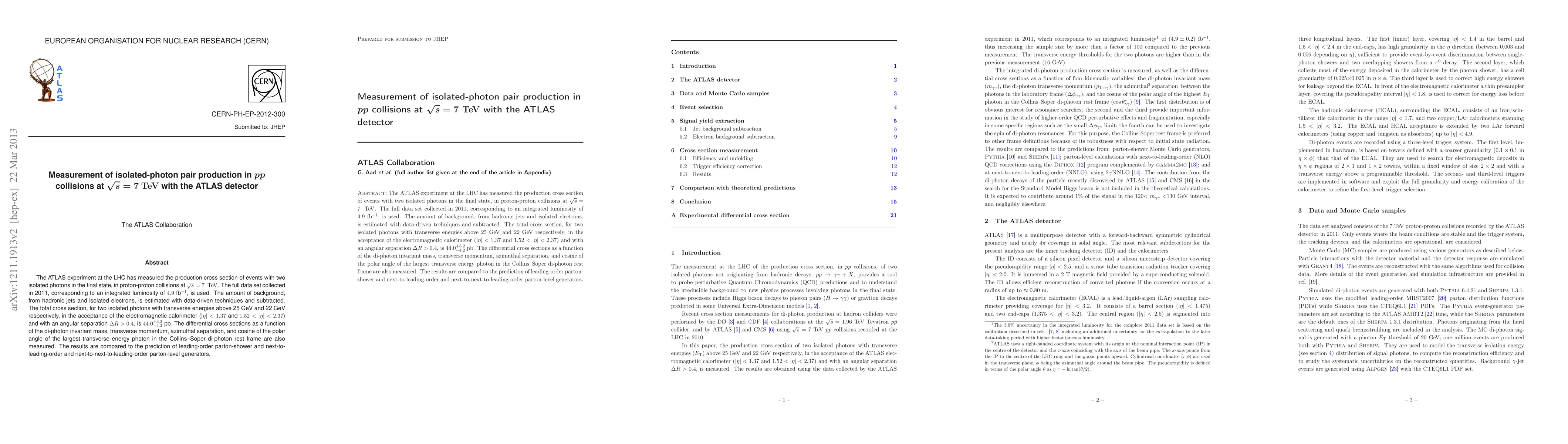 The ATLAS experiment measured the production cross section of isolated-photon pairs in proton-proton collisions at 7 TeV, with a total cross section of 44.0 pb, and found differential distributions that compare well to predictions from parton-shower generators.