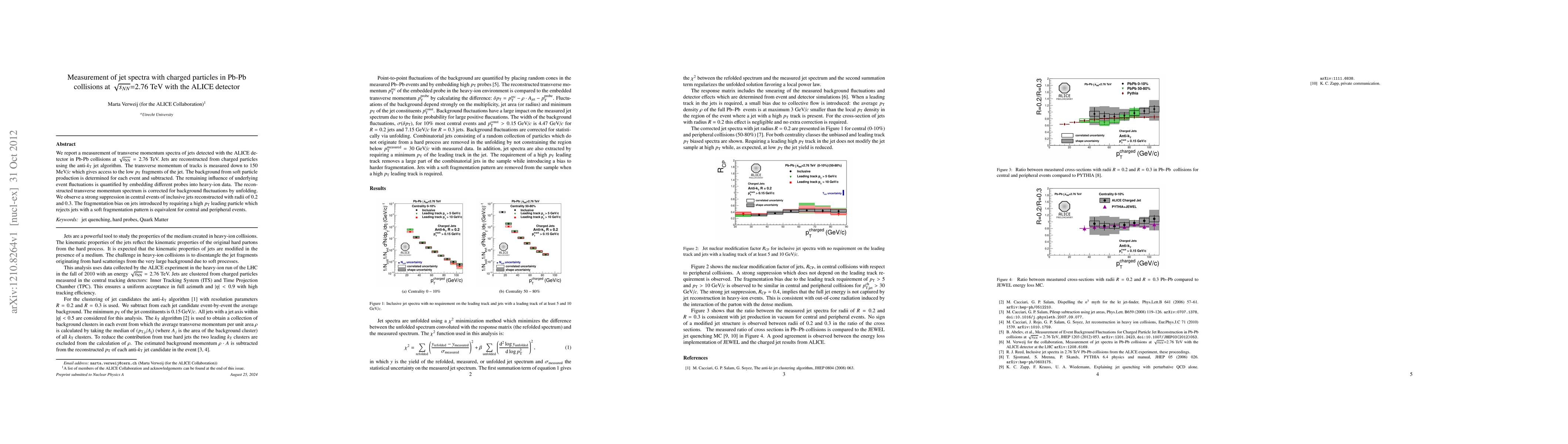 We report a measurement of transverse momentum spectra of jets detected with the ALICE detector in Pb-Pb collisions at $\sNN=2.76$ TeV. Jets are reconstructed from charged particles using the anti-\kt jet algorithm. The transverse momentum of tracks is measured down to 150 MeV/$c$ which gives access to the low \pt fragments of the jet. The background from soft particle production is determined for each event and subtracted. The remaining influence of underlying event fluctuations is quantified by embedding different probes into heavy-ion data. The reconstructed transverse momentum spectrum is corrected for background fluctuations by unfolding. We observe a strong suppression in central events of inclusive jets reconstructed with radii of 0.2 and 0.3. The fragmentation bias on jets introduced by requiring a high \pt leading particle which rejects jets with a soft fragmentation pattern is equivalent for central and peripheral events.
