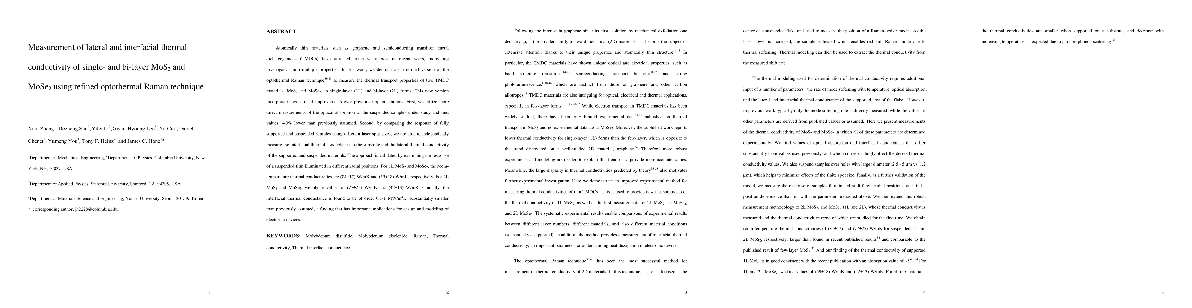 This paper presents a refined optothermal Raman technique to measure the lateral and interfacial thermal conductivities of single- and bi-layer MoS2 and MoSe2, finding significantly lower interfacial thermal conductance values (~0.1-1 MW/m²K) than previously assumed, which impacts device modeling and design.