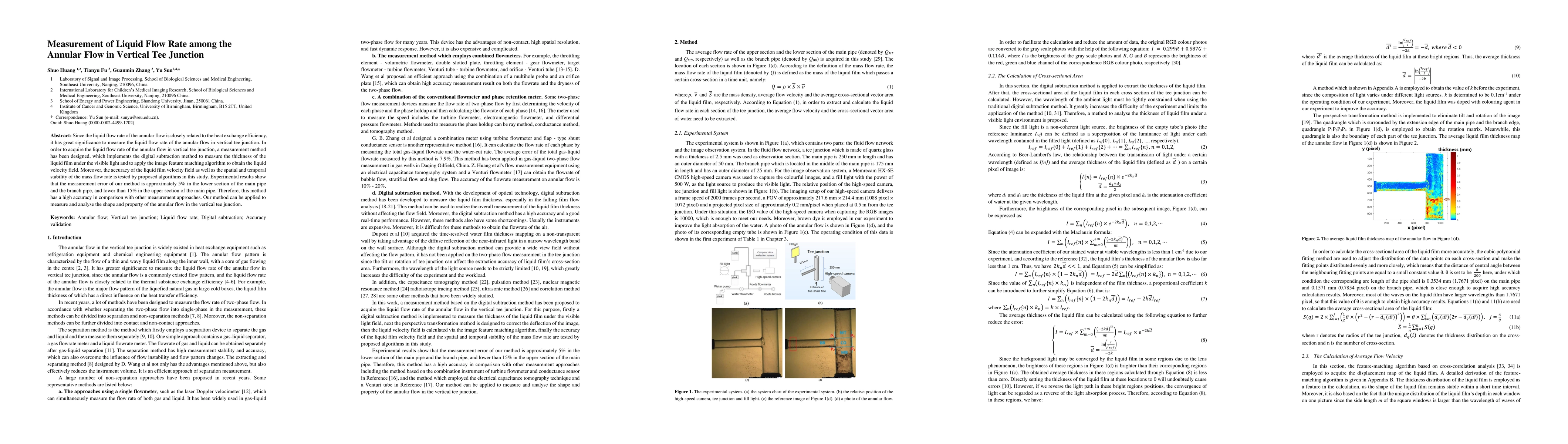 Since the liquid flow rate of the annular flow is closely related to the heat exchange efficiency, it has great significance to measure the liquid flow rate of the annular flow in vertical tee junction. In order to acquire the liquid flow rate of the annular flow in vertical tee junction, a measurement method has been designed, which implements the digital subtraction method to measure the thickness of the liquid film under the visible light and to apply the image feature matching algorithm to obtain the liquid velocity field. Moreover, the accuracy of the liquid film velocity field as well as the spatial and temporal stability of the mass flow rate is tested by proposed algorithms in this study. Experimental results show that the measurement error of our method is approximately 5% in the lower section of the main pipe and the branch pipe, and lower than 15% in the upper section of the main pipe. Therefore, this method has a high accuracy in comparison with other measurement approaches. Our method can be applied to measure and analyse the shape and property of the annular flow in the vertical tee junction.