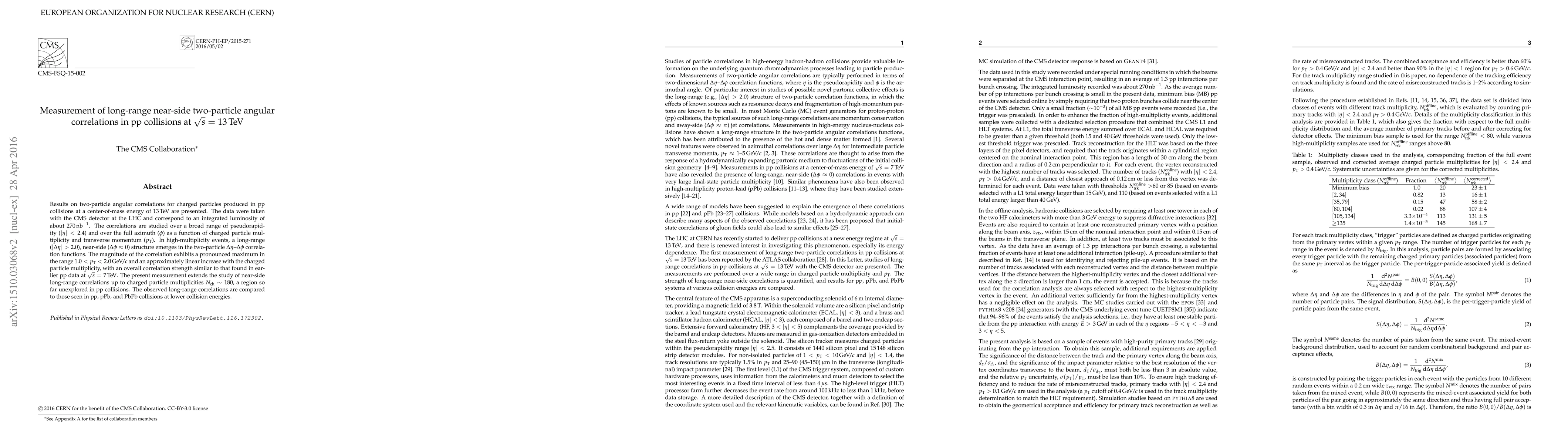 This paper reports on two-particle angular correlations in pp collisions at 13 TeV, revealing a long-range near-side structure in high-multiplicity events. The correlations show a maximum correlation strength in the transverse momentum range of 1.0-2.0 GeV/c and increase linearly with particle multiplicity, extending previous findings to much higher multiplicities.