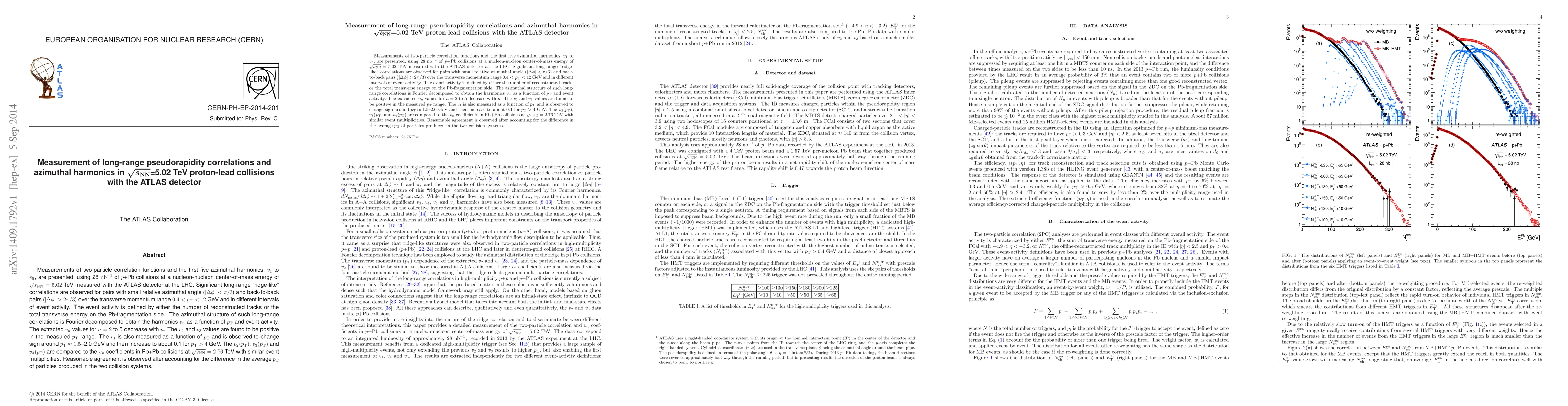 ATLAS detector measures long-range pseudorapidity correlations and azimuthal harmonics in proton-lead collisions at 5.02 TeV, observing significant 'ridge-like' correlations with small relative angles and decreasing harmonics with increasing n