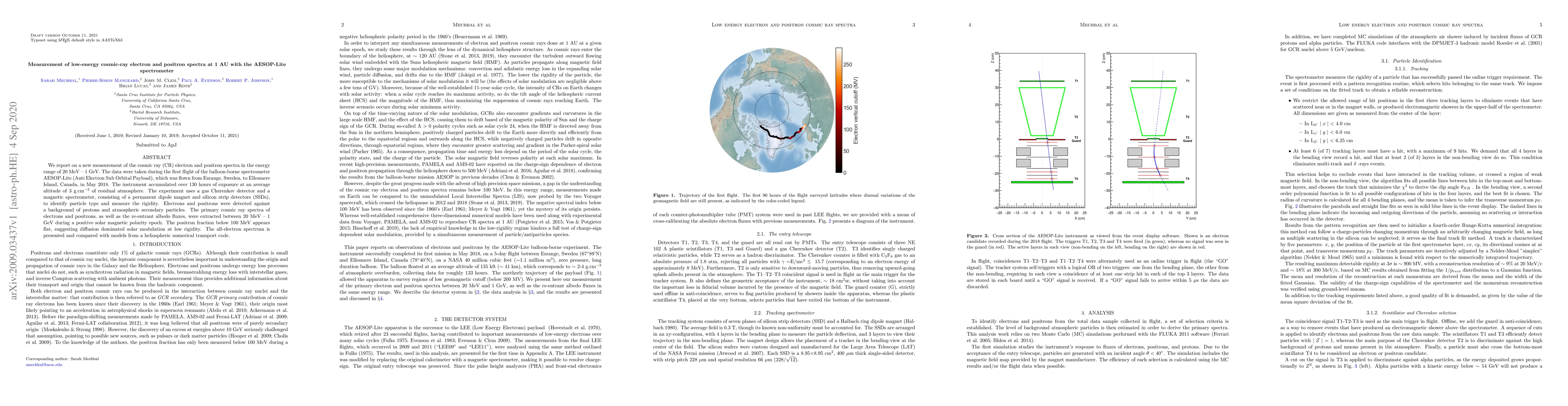 We report on a new measurement of the cosmic ray (CR) electron and positron spectra in the energy range of 20 MeV -- 1 GeV. The data were taken during the first flight of the balloon-borne spectrometer AESOP-Lite (Anti Electron Sub Orbital Payload), which was flown from Esrange, Sweden, to Ellesmere Island, Canada, in May 2018. The instrument accumulated over 130 hours of exposure at an average altitude of 3 g.cm$^{-2}$ of residual atmosphere. The experiment uses a gas Cherenkov detector and a magnetic spectrometer, consisting of a permanent dipole magnet and silicon strip detectors (SSDs), to identify particle type and measure the rigidity. Electrons and positrons were detected against a background of protons and atmospheric secondary particles. The primary cosmic ray spectra of electrons and positrons, as well as the re-entrant albedo fluxes, were extracted between 20 MeV -- 1 GeV during a positive solar magnetic polarity epoch. The positron fraction below 100 MeV appears flat, suggesting diffusion dominated solar modulation at low rigidity. The all-electron spectrum is presented and compared with models from a heliospheric numerical transport code.