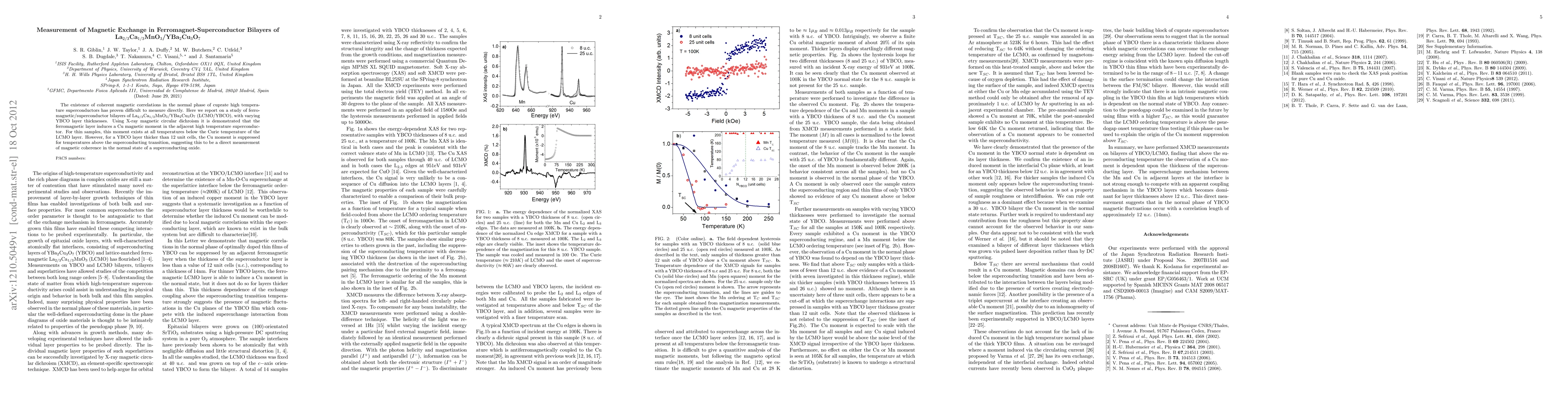 This study investigates magnetic exchange in bilayers of ferromagnetic La2/3Ca1/3MnO3/high-temperature superconductor YBa2Cu3O7, revealing that the ferromagnetic layer induces a Cu magnetic moment in the superconductor. For thin superconductor layers, this moment persists below the Curie temperature, while thicker layers suppress it above the superconducting transition, indicating magnetic coherence in the normal state.