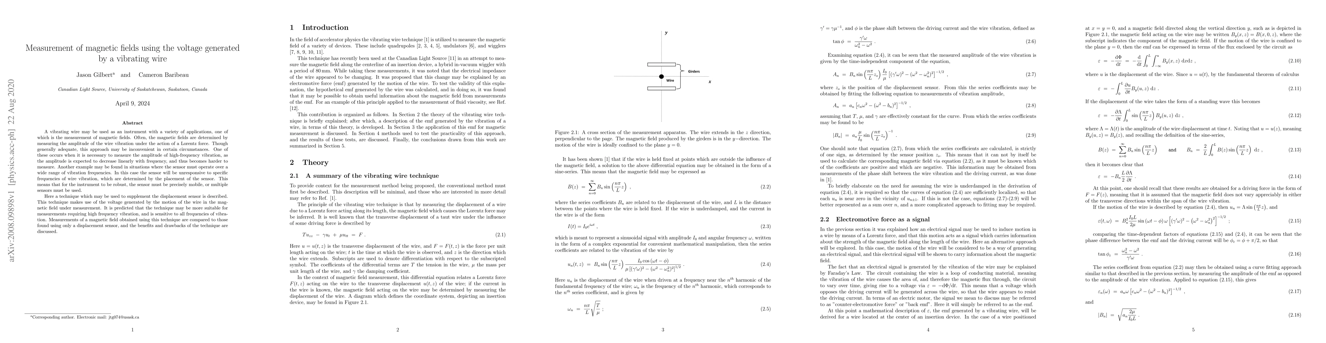 A vibrating wire may be used as an instrument with a variety of applications, one of which is the measurement of magnetic fields. Often, the magnetic fields are determined by measuring the amplitude of the wire vibration under the action of a Lorentz force. Though generally adequate, this approach may be inconvenient in certain circumstances. One of these occurs when it is necessary to measure the amplitude of high-frequency vibration, as the amplitude is expected to decrease linearly with frequency, and thus becomes harder to measure. Another example may be found in situations where the sensor must operate over a wide range of vibration frequencies. In this case the sensor will be unresponsive to specific frequencies of wire vibration, which are determined by the placement of the sensor. This means that for the instrument to be robust, the sensor must be precisely mobile, or multiple sensors must be used. Here a technique which may be used to supplement the displacement sensor is described. This technique makes use of the voltage generated by the motion of the wire in the magnetic field under measurement. It is predicted that the technique may be more suitable for measurements requiring high frequency vibration, and is sensitive to all frequencies of vibration. Measurements of a magnetic field obtained using this technique are compared to those found using only a displacement sensor, and the benefits and drawbacks of the technique are discussed.