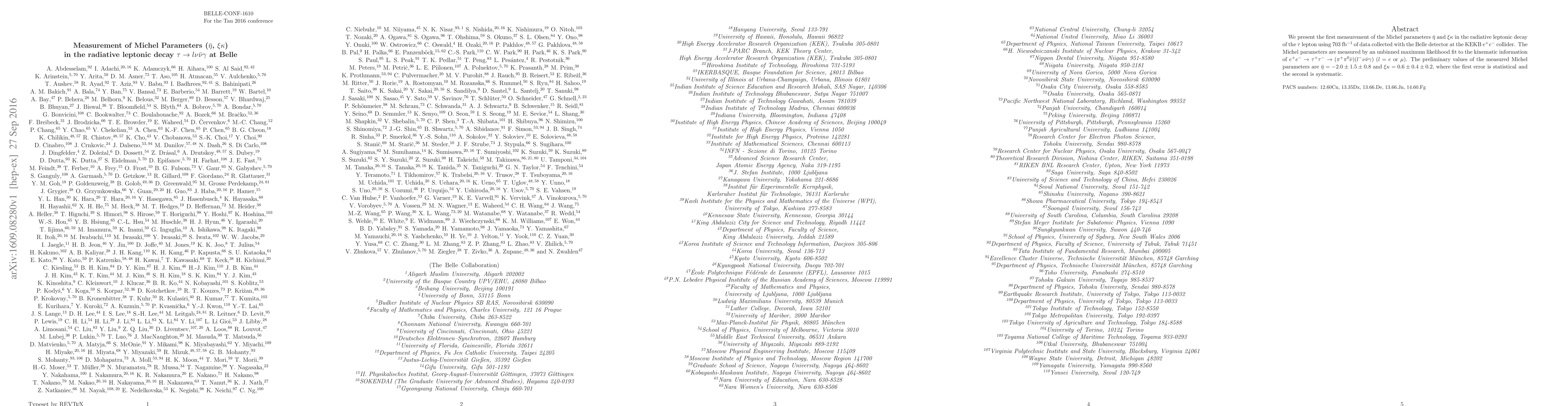 This paper reports the first measurement of the Michel parameters $\bar{\eta}$ and $\xi\kappa$ in the radiative leptonic decay of the $\tau$ lepton using data from the Belle detector at the KEKB collider, yielding preliminary values of $\bar{\eta} = -2.0 \pm 1.5 \pm 0.8$ and $\xi\kappa = 0.6 \pm 0.4 \pm 0.2$.