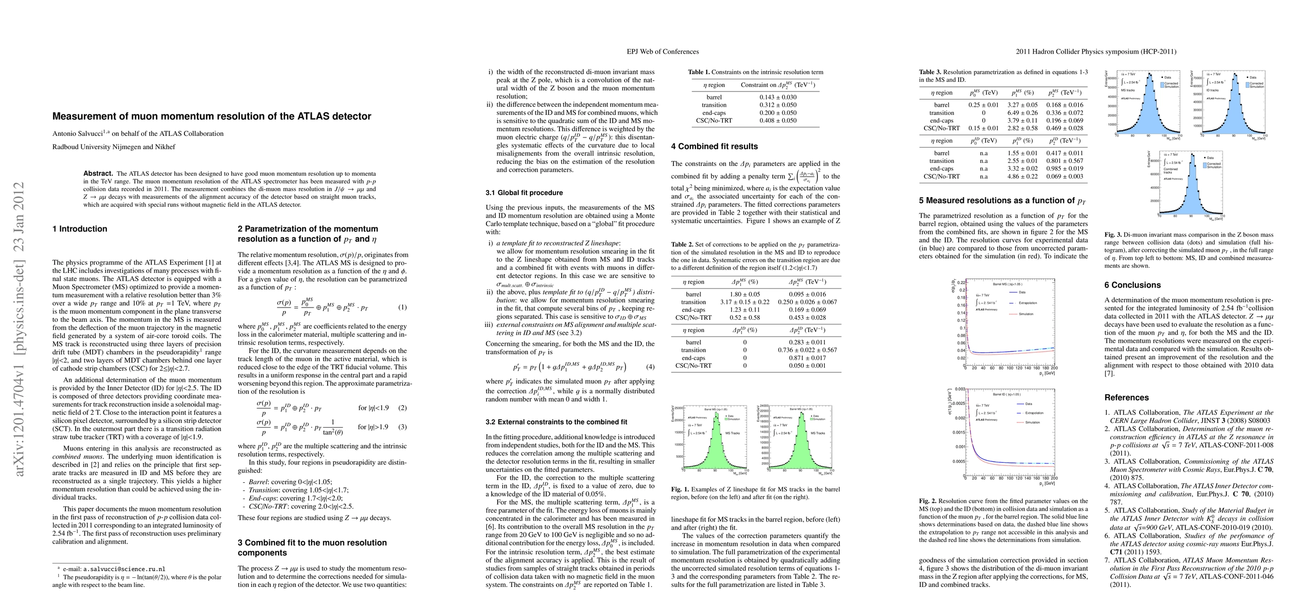 This paper measures the muon momentum resolution of the ATLAS detector using 2011 proton-proton collision data, combining di-muon mass resolutions from J/\Psi and Z decays with alignment accuracy assessments from straight muon tracks recorded without magnetic field. The results demonstrate the detector's capability to accurately measure muon momenta up to the TeV range.