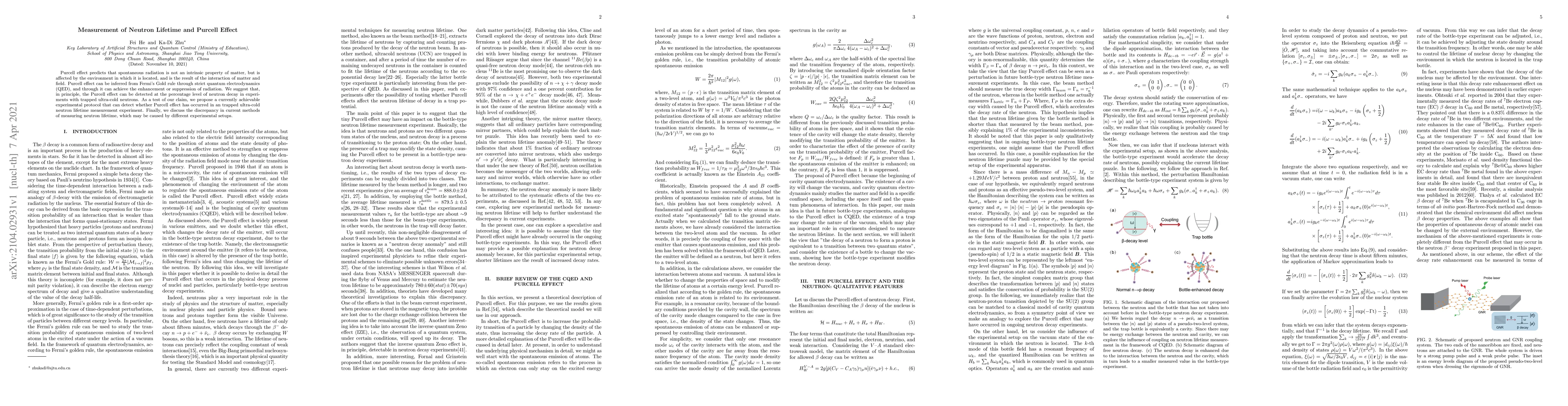 The paper discusses how the Purcell effect, which affects spontaneous radiation based on environmental interactions, can potentially be detected at the level of neutron decay in ultra-cold neutron experiments. It proposes a feasible experimental protocol to verify this effect and addresses discrepancies in current neutron lifetime measurement methods due to differing setups.