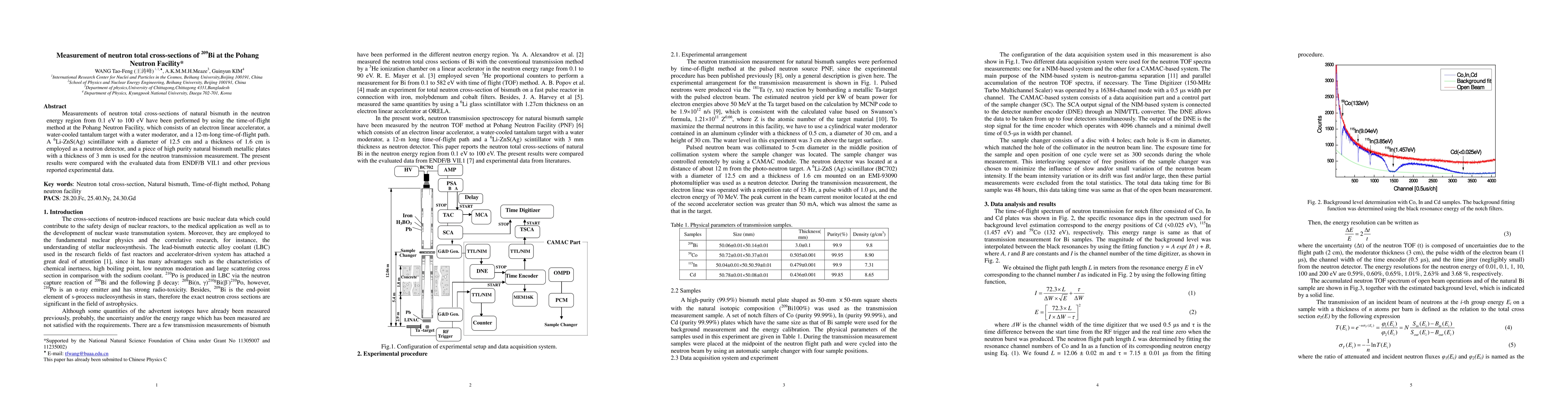 Measurements of neutron total cross-sections of natural bismuth in the neutron energy region from 0.1 eV to 100 eV have been performed by using the time-of-flight method at the Pohang Neutron Facility, which consists of an electron linear accelerator, a water-cooled tantalum target with a water moderator, and a 12-m-long time-of-flight path. A 6Li-ZnS(Ag) scintillator with a diameter of 12.5 cm and a thickness of 1.6 cm is employed as a neutron detector, and a piece of high purity natural bismuth metallic plates with a thickness of 3 mm is used for the neutron transmission measurement. The present results were compared with the evaluated data from ENDF/B VII.1 and other previous reported experimental data.